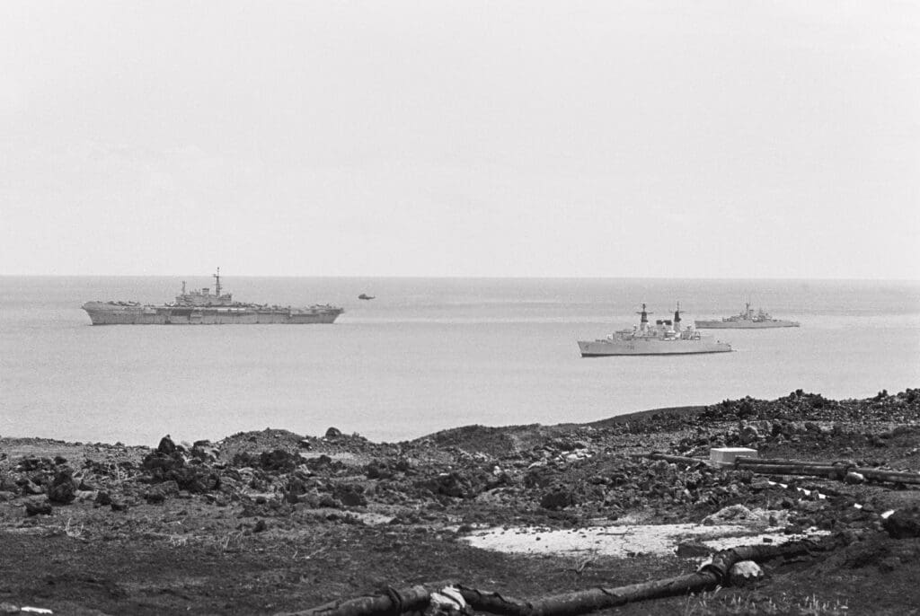 El “Hermes” y su escolta en Ascensión. Foto: Bob Shackleton vía Naval History