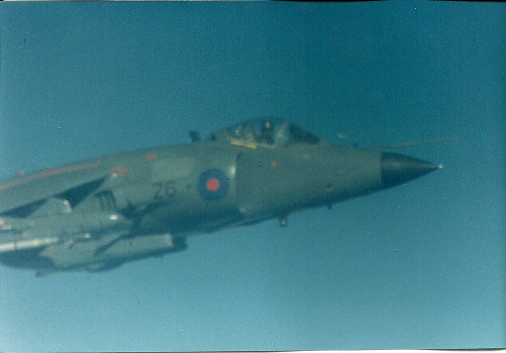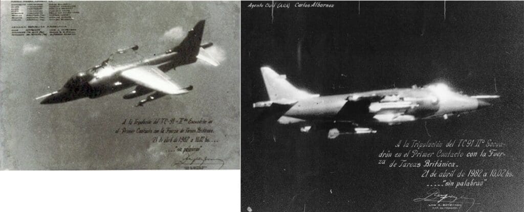 Sin embargo, el avistamiento de la fuerza de tareas británica no sería sin consecuencias. Aproximadamente a las 1250, el TC-91 es interceptado y escoltado por un caza Sea Harrier FRS.1 del 800 Naval Air Squadron al mando del Lieutenant S. Hargreaves. Minutos antes, el novato piloto naval se estaba alistando para realizar un nuevo vuelo de entrenamiento desde la cubierta del HMS “Hermes”, cuando llegó el aviso de un contacto radar. Con el tiempo en contra, el personal de armamento pudo reconfigurar al Sea Harrier con dos misiles aire-aire AIM-9L Sidewinder, debiendo despegar sin disponer de munición para sus cañones ADEN de 30mm.