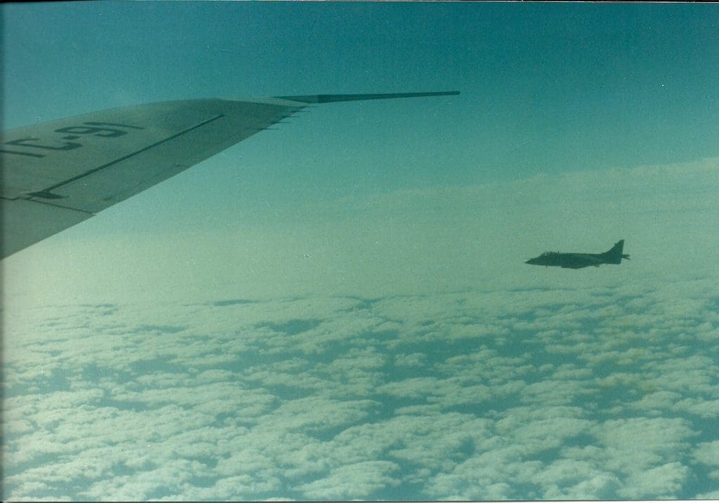 Con la presencia amenazadora del caza naval británico, el comandante del TC-91 decidió ascender hasta nivel óptimo. El piloto del Sea Harrier realizo diversas maniobras en torno al B-707 (ocasión aprovechada por ambas partes para tomar fotografías) siempre manteniendo la distancia y sin que las mismas implicaran riesgo para el cuatrimotor argentino. Las Reglas de Empeñamiento de la TF 317 no permitían el uso de armamento contra intrusos, sin embargo establecían que las patrullas aérea de combate deberían escoltarlos y disuadirlos de realizar un pasaje sobre el núcleo de la flota.