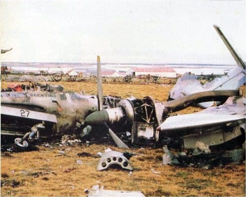 Mientras tanto, en la Bahía Elefante, fue avistado un combate aéreo que tuvo como resultado la caída de un Mirage III propio junto al Teniente Perona, quien fue rescatado por el personal naval. García Cuerva, su compañero, ya sin combustible en sus depósitos, intentando realizar un aterrizaje en la pista de la BAM Malvinas fue derribado por acción de la artillería antiaérea argentina, al no poder identificarlo como aeronave propia.