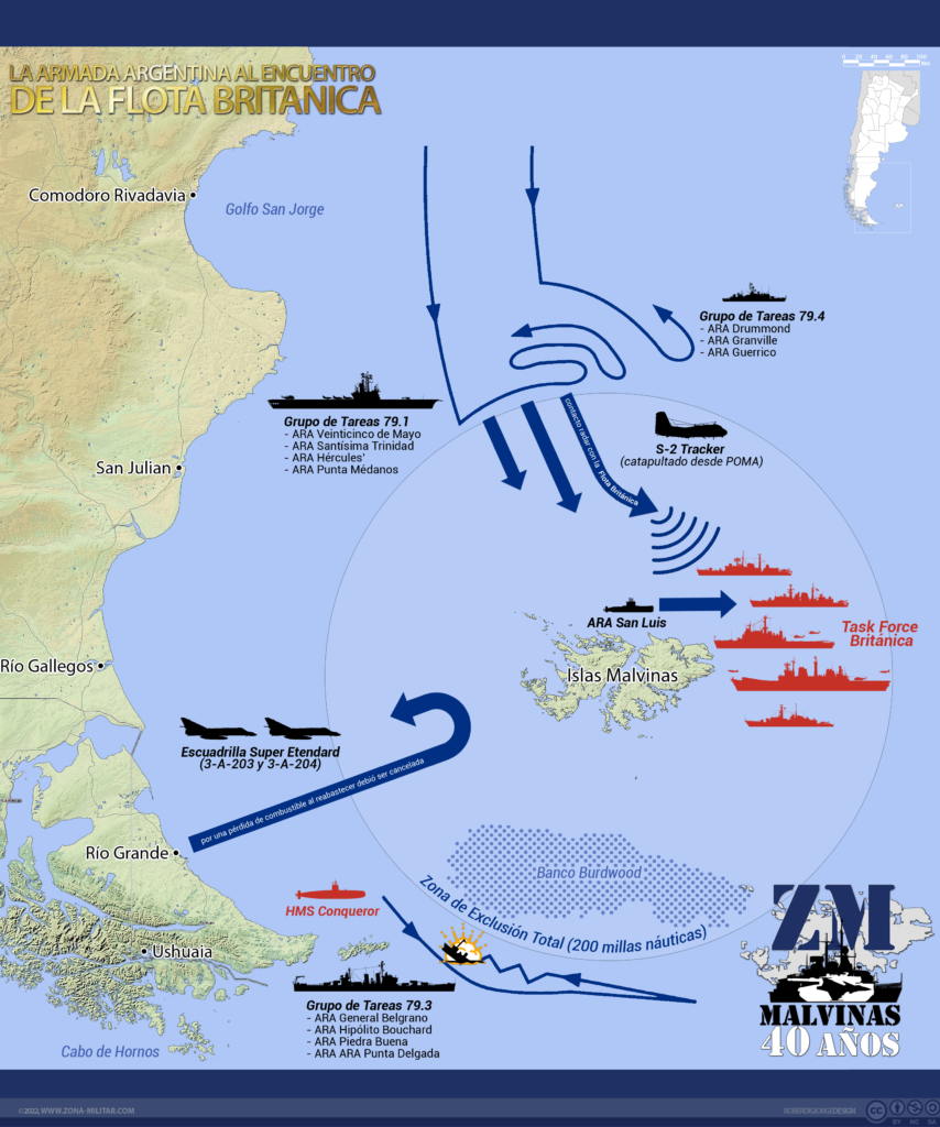 Según la información a la que hemos podido acceder, si bien los británicos realizaron una serie de planeamientos para enfrentarnos el presente día, nuestras Fuerzas Armadas no se quedaron atrás: durante las 15:13 horas, el 2-AS-23 con el CC Dabini, obtuvo contacto con 7 blancos estimados de la Task Force en latitud 49°34´(S), longitud 57°10´(W). Para las 23:00 horas, se mantuvo el contacto en latitud 50°00´(S) longitud 56°25´(W) localizando un blanco grande y tres medianos. Como resultado, el Comandante de la Flota de Mar ordenó la planificación de un ataque durante las primeras horas de mañana (2 de mayo). Esperamos acceder a mayor información de los movimientos de nuestras Fuerzas durante las próximas horas.