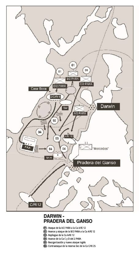 El avance de las compañías paracaidistas británicas fue lento, empleando en múltiples ocasiones misiles antitanque guiados Milan para despejar y dejar fuera de combate a las trincheras argentinas. De esta forma, las fuerzas británicas iniciaron el asalto final a las posiciones argentinas que seguían combatiendo en las colinas de Darwin, Darwin Brigde y Boca House; reportando a las 13:30 que habían asegurado las posiciones, no sin haber sufrido importantes bajas en heridos, muertos, y agotando reservas de munición. Próximamente, iniciarían el avance contra otras posiciones de ubicada sobre Darwin.