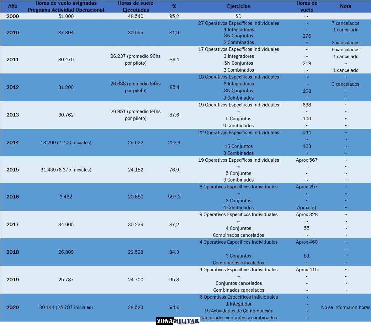 Lamentablemente la información brindada en este y otros documentos oficiales sigue siendo muy superficial, no pudiendo constatar datos que sumarían valor al análisis y permitirían brindar un panorama más completo sobre las Fuerzas Armadas, tales como tasa de disponibilidad, horas de vuelo requeridas, costos de hora de vuelo y mantenimiento, entre otros.