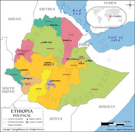 Etiopía se encuentra en la región oriental de África, por debajo del Sahel. Se trata de una nación cristiana, rodeada de países musulmanes. Como otros países de la región, es muy fuerte la división étnica que existe fronteras adentro (una situación similar a la de Somalia con sus clanes, pero que en Etiopía la distribución etnia – región es muy marcada). Etiopía cuenta con 11 regiones federales, donde en cada una habita una etnia predominante. Es importante tener en cuenta que cada región cuenta con una gran autonomía. De hecho, la constitución[1] etíope de 1994 se basa en el concepto de “federalismo étnico” para definir la autonomía de sus regiones.