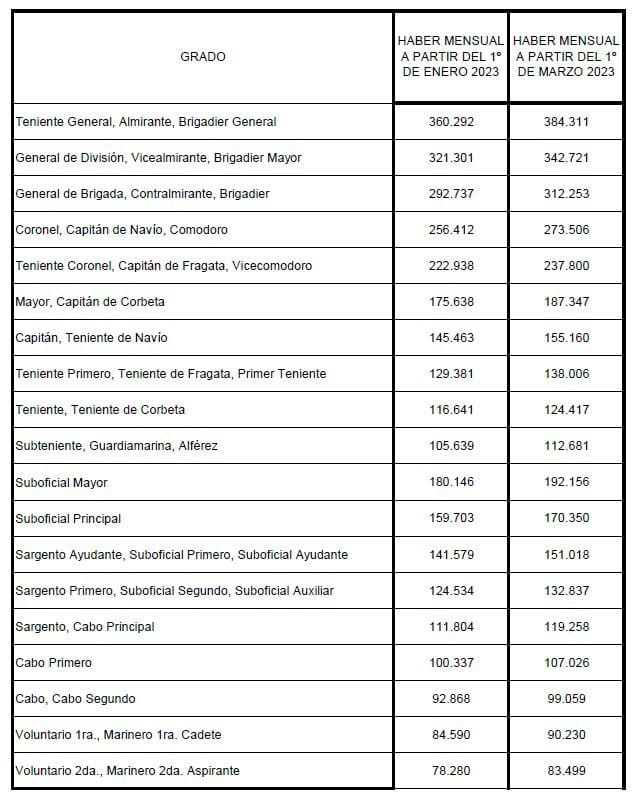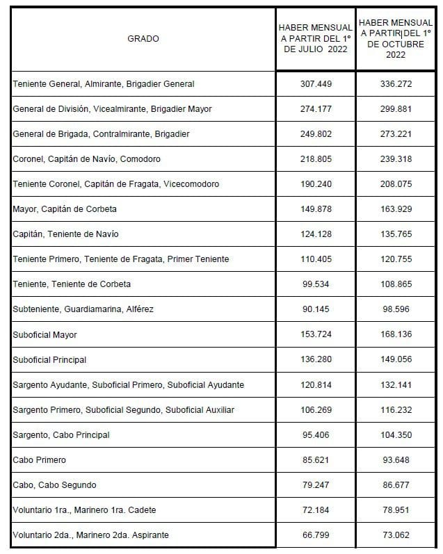 A continuación, dejamos la nueva escala de haberes para el personal militar de las Fuerzas Armadas Argentinas, que regirá a partir del 1 de julio de 2022; como sus actualizaciones en octubre de 2022, al igual que los meses de enero y marzo de 2023.