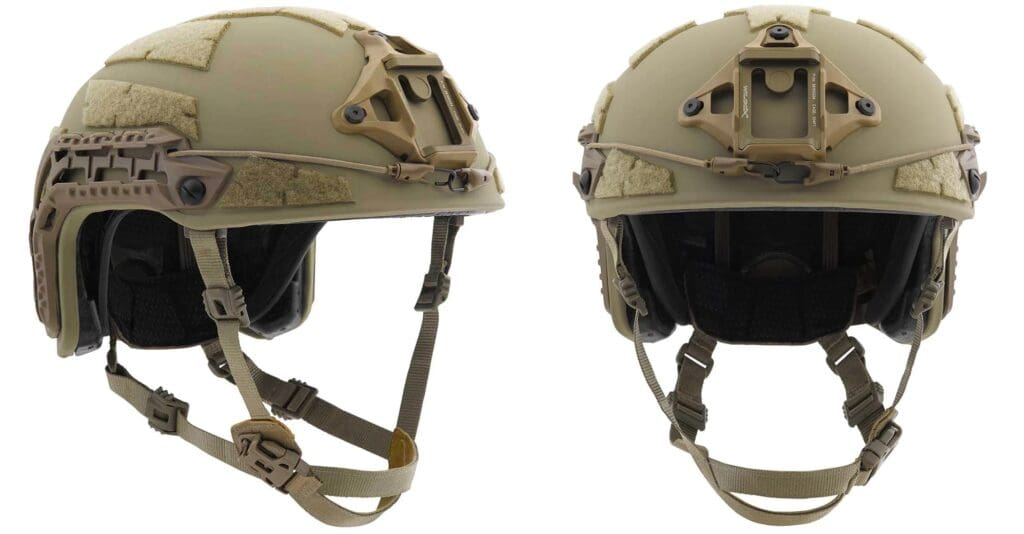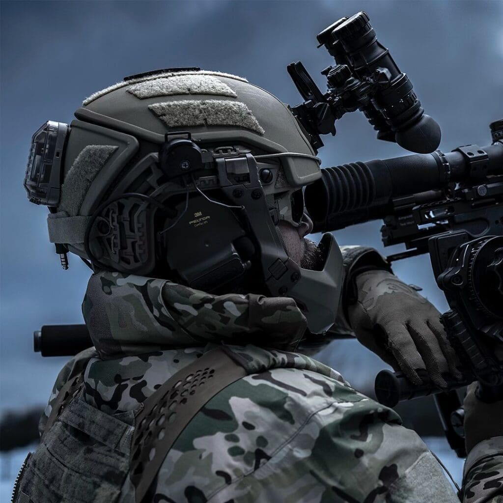 El kit de accesorios incluye un soporte frontal multiuso para montar visores nocturnos/termales, sistemas de rieles laterales para acoplar diversos accesorios, un visor de tres posiciones y protectores balísticos de mandíbula para cubrir cabeza y rostro contra los efectos de explosiones, fragmentos y golpes.