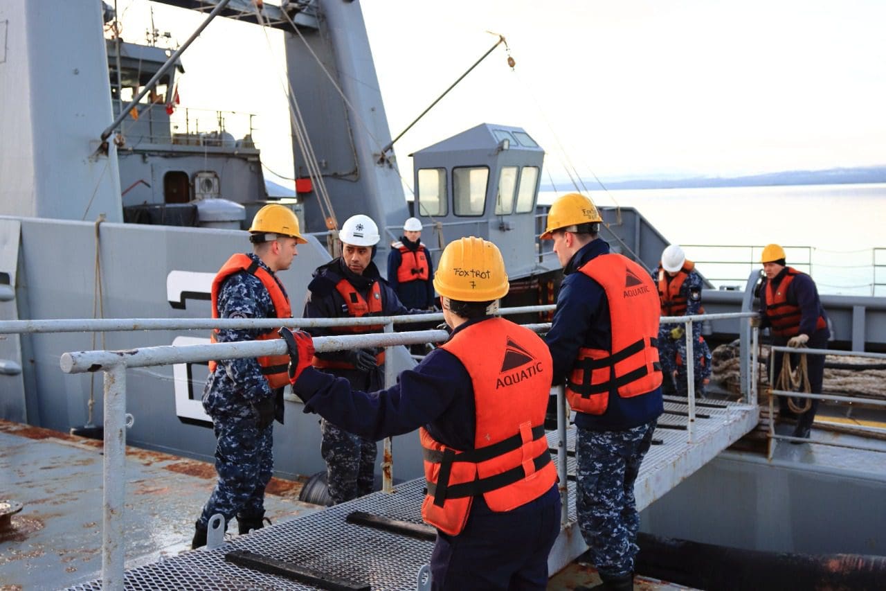 - Despliegue de barreras contra la contaminación; buceo combinado diurno y nocturno por parte de la Partida de Salvataje del Distrito Naval Beagle y del Área Naval Austral