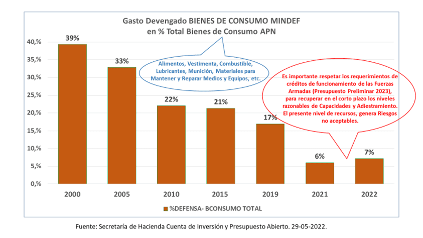 Se puede verificar esta situación, observando el comportamiento de los últimos 20 años del crédito de Bienes de Consumo (Gastos Corrientes) del Ministerio de Defensa en % de la APN (Gráfico Bienes de Consumo de la Jurisdicción Ministerio de Defensa 2020-2022).