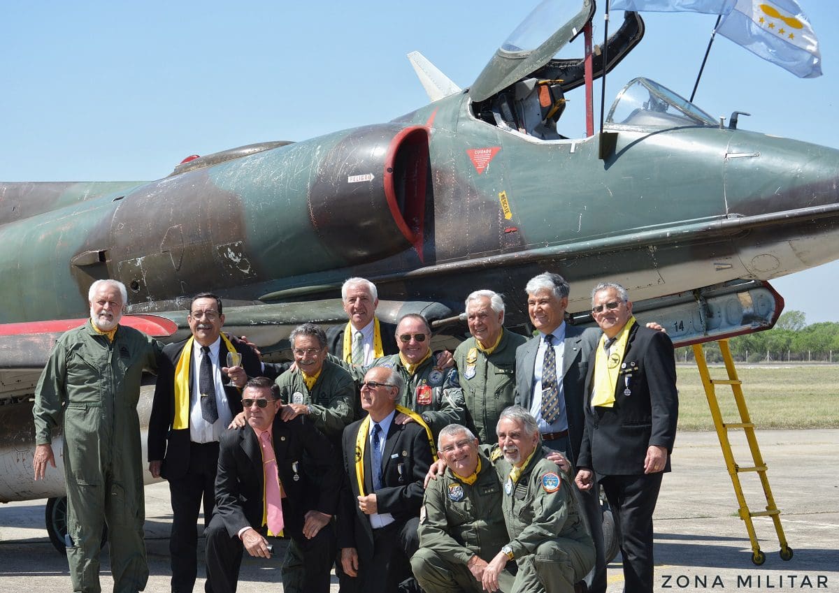 De esta forma, para brindar un marco ideal, se pudo observar en la pista de la V Brigada Aérea una línea de vuelo conformada por siete A-4AR Fightinghawk junto a un A-4B Skyhawk. Sirviendo este último como nexo conductor entre las generaciones pasadas de pilotos del sistema de armas, los cuales pasan el testigo a la nueva camada de Halcones que custodiaran los cielos argentinos.