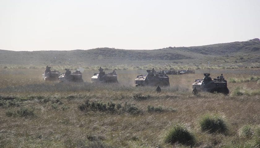 Por última, por medio de las imágenes divulgadas por la Armada Argentina, se pudo apreciar el despliegue de vehículos anfibios LVTP-7A1 y utilitarios HUMVEE. En lo referido a artillería destacó el empleo de cañones antiaéreos Bofors L40/70 y cañones M114A1 de 155mm.