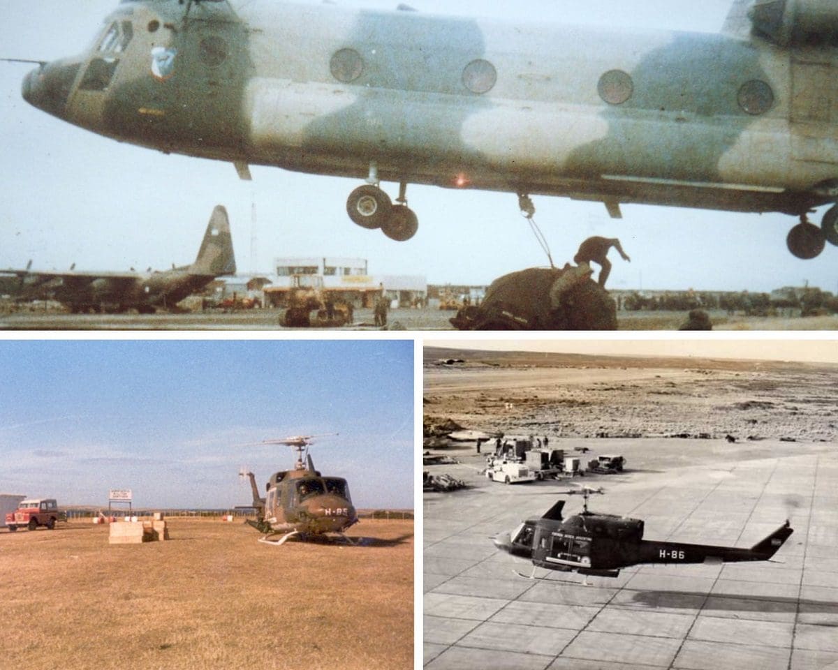 En Malvinas, la Fuerza Aérea Argentina constituyó el Escuadrón Helicópteros integrado por dos BV-308 Chinook (H-91 y H-93) y dos Bell 212 H-83 y H-85 de la VII Brigada Aérea. Personal y aeronaves formarían parte de la Base Aérea Militar Cóndor, lugar desde el cual operarían a lo largo del conflicto cumpliendo con un sinnúmero de tareas: transporte de tropas y material, búsqueda y rescate, infiltración/exfiltración de efectivos de la ROA, entre otras. Los Chinook lograrían replegarse al continente el 9 de junio, resultando capturados los dos Bell 212.