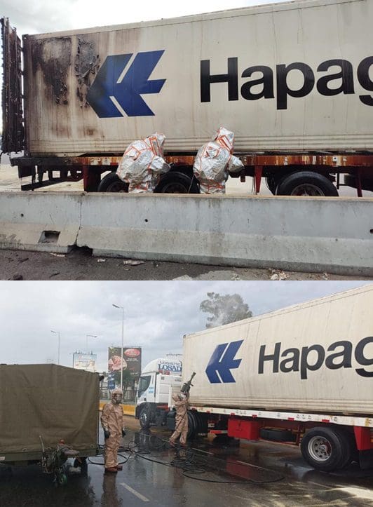 En coordinación con las autoridades locales y de seguridad intervinientes, las tareas que se llevan adelante consisten en la detección y descontaminación del químico remanente en el lugar del incidente, mediante el despliegue de personal y cuatro vehículos especializados de la Compañía de ingenieros.