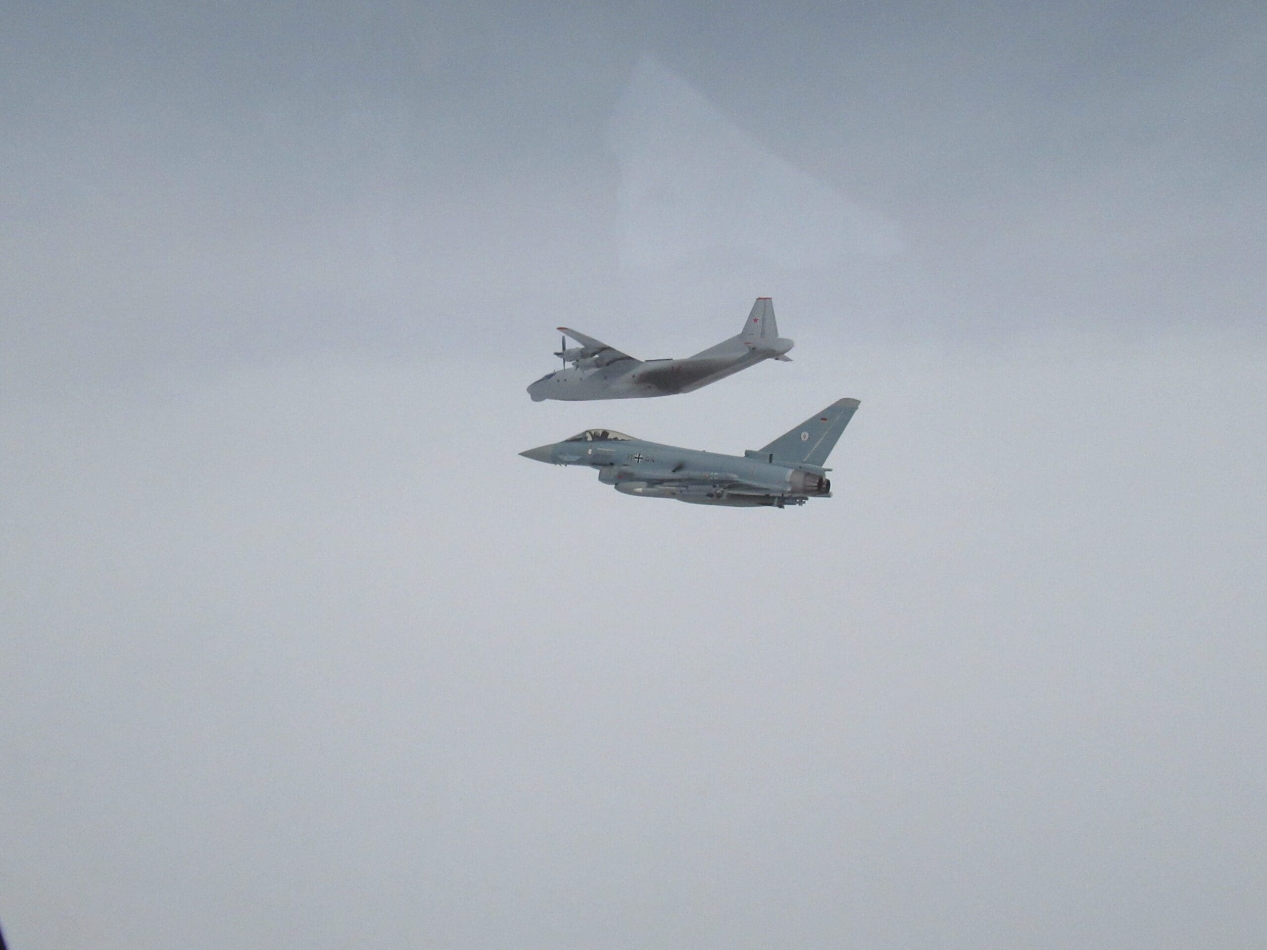 Arribados a las coordenadas, los pilotos de los Typhoon identificaron a las aeronaves rusas en cuestión, tratandose de un avión de transporte de pasajeros Tu-134 (nombre código “Crusty”), un AN-12 Cub de transporte militar, ambos siendo escoltados por una pareja de cazabombarderos Sukhoi Su-27.