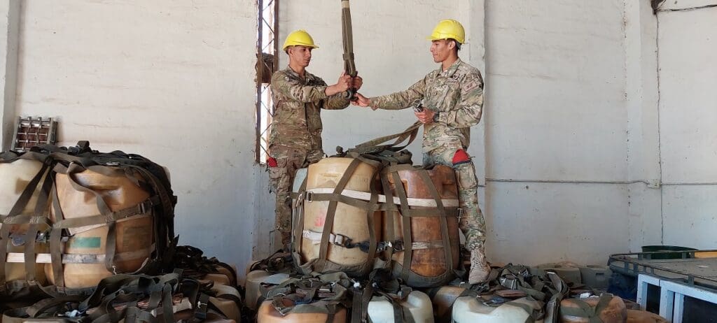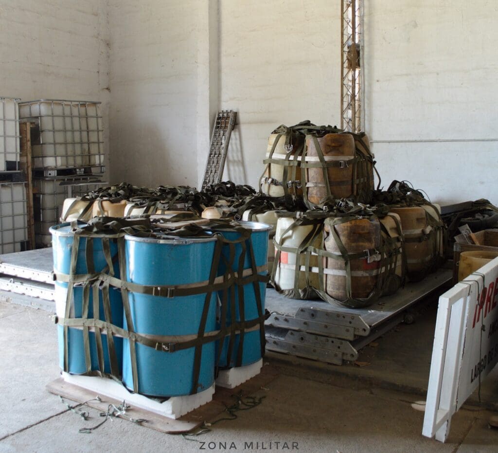 El siguiente paso, en lo que a volumen de carga se refiere, lo constituye el contenedor A22, el cual tiene una capacidad de hasta 1000kg. Este sistema de entrega es uno de los más populares ya que puede emplearse y adaptarse a todo tipo de carga. El proceso incluye el ajuste y centrado de la carga, cerrándose con las hebillas de fricción (3 de cada lado). Posteriormente, se vincula con bandas de extensión y con banda de 3 pies/ 3 vuelta, a la cual se vincula el raiser del paracaídas G12. De acuerdo con la explicación que nos brindó el encargado de la Sección, el sargento primero Matías Alanís, el contenedor A22 resulta práctico para cargas como: motocicletas, bidones de agua, tanques de combustible, efectos de intendencia, alimentos, etc.