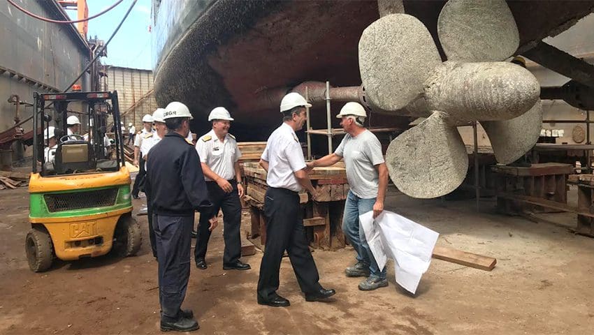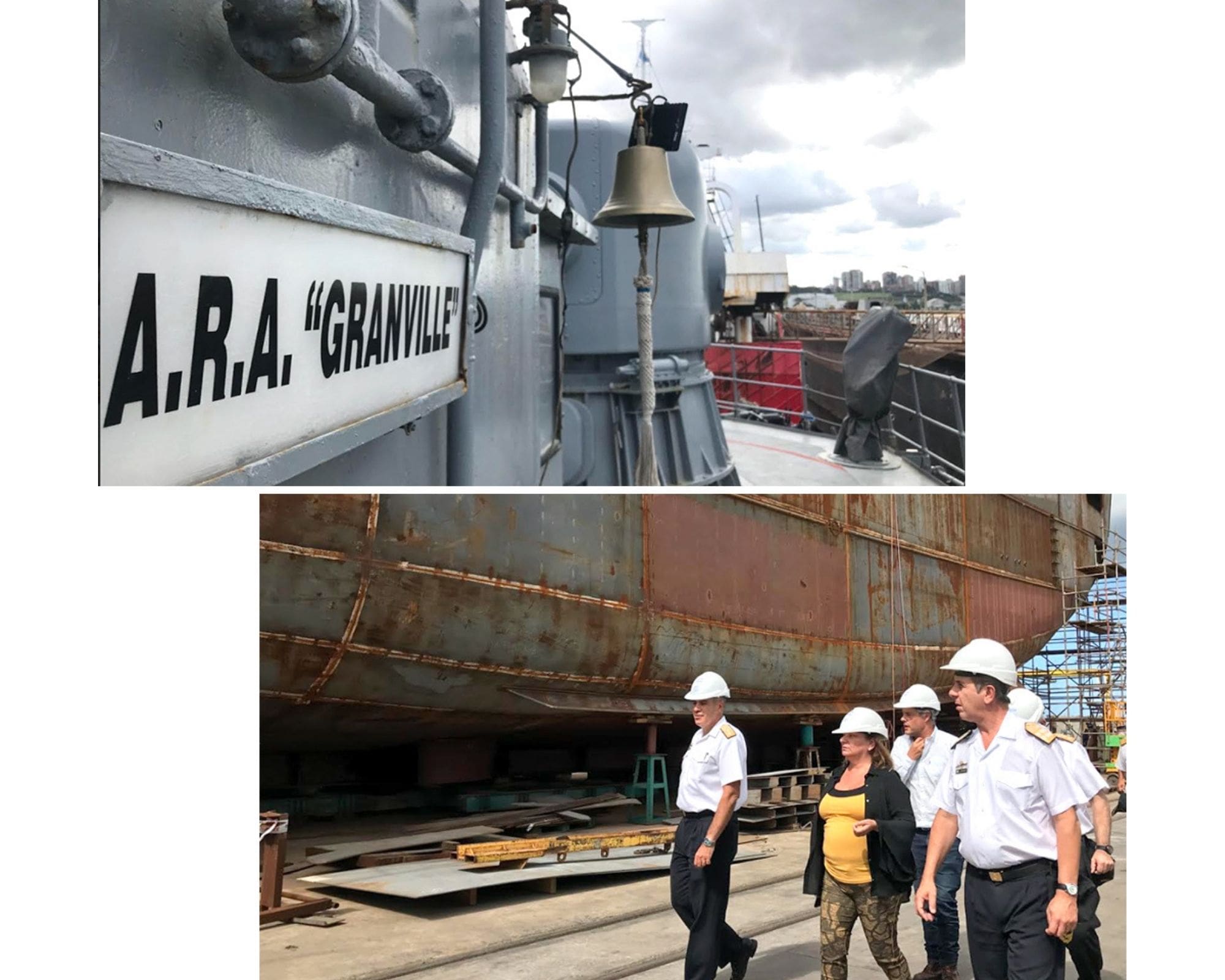 La recorrida por el astillero culminó con la visita al dique donde se encuentra la unidad de la Armada. En el lugar fueron recibidos, además, por el Comandante del buque, Capitán de Fragata Raúl Oscar Closter, personal de la tripulación y del Arsenal Naval Mar del Plata, quienes están realizando diferentes obras y trabajos a bordo.