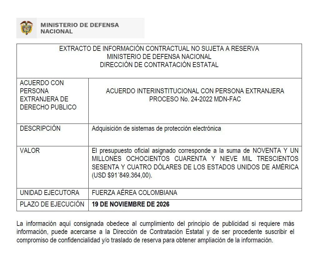 También dentro las condiciones del mencionado documento, la Fuerza Aérea Colombiana indicó que deberán instalarse sistemas avanzados de autoprotección con contramedidas electrónicas que protejan las aeronaves contra ataques desde tierra, como de misiles aire-aire.