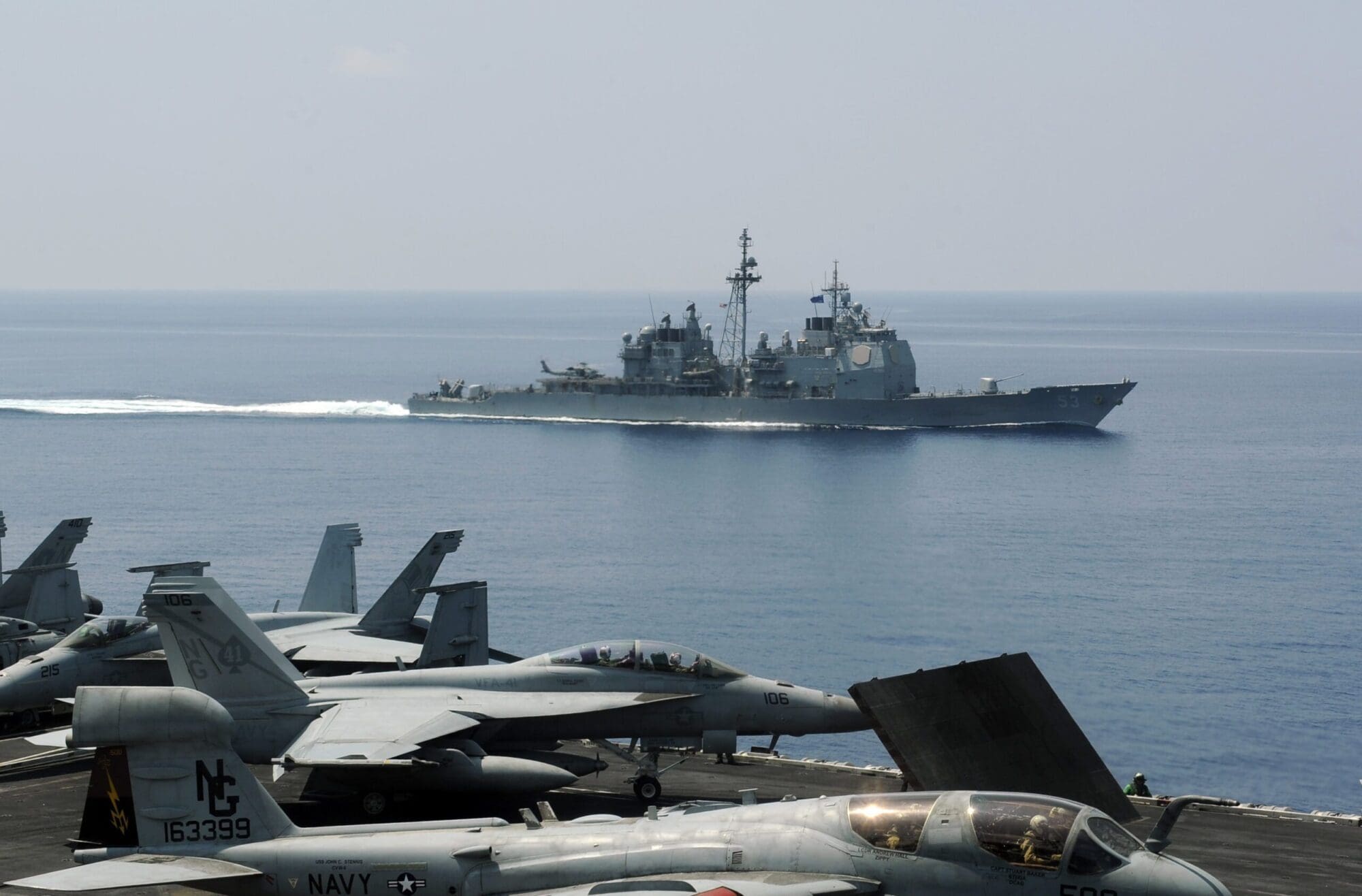 En lo referido al USS Mobile Bay (CG 53) fue construido por el astillero Ingalls Shipbuilding en Pensacola, siendo comisionado el 21 de febrero de 1987. Entre su historial operativo destacan la evacuación de la Embajada de los Estados Unidos en Beirut; el lanzamiento de misiles de crucero Tomahawk durante la Operación Tormenta del Desierto; y el apoyo a la evacuación de damnificados por la erupción del volcán del monte Pinatubo en Filipinas.