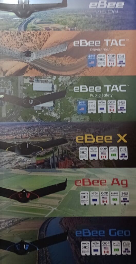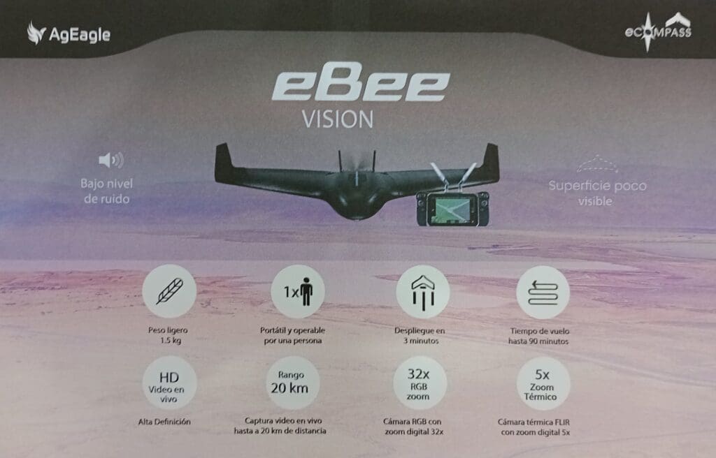El EBeeTAC para mapeo táctico, que es una aeronave UAV con 4 características de uso militar: la primera que es totalmente camuflado para que la fuerza pueda mimetizarlo en los vuelos, el dron tiene una encriptación en sus comunicaciones AEA556 y adicionalmente borra los datos en caso de ser derribada y la ultima es que solo necesitas un operario y en tres minutos y ya se encuentra tomando la información táctica.