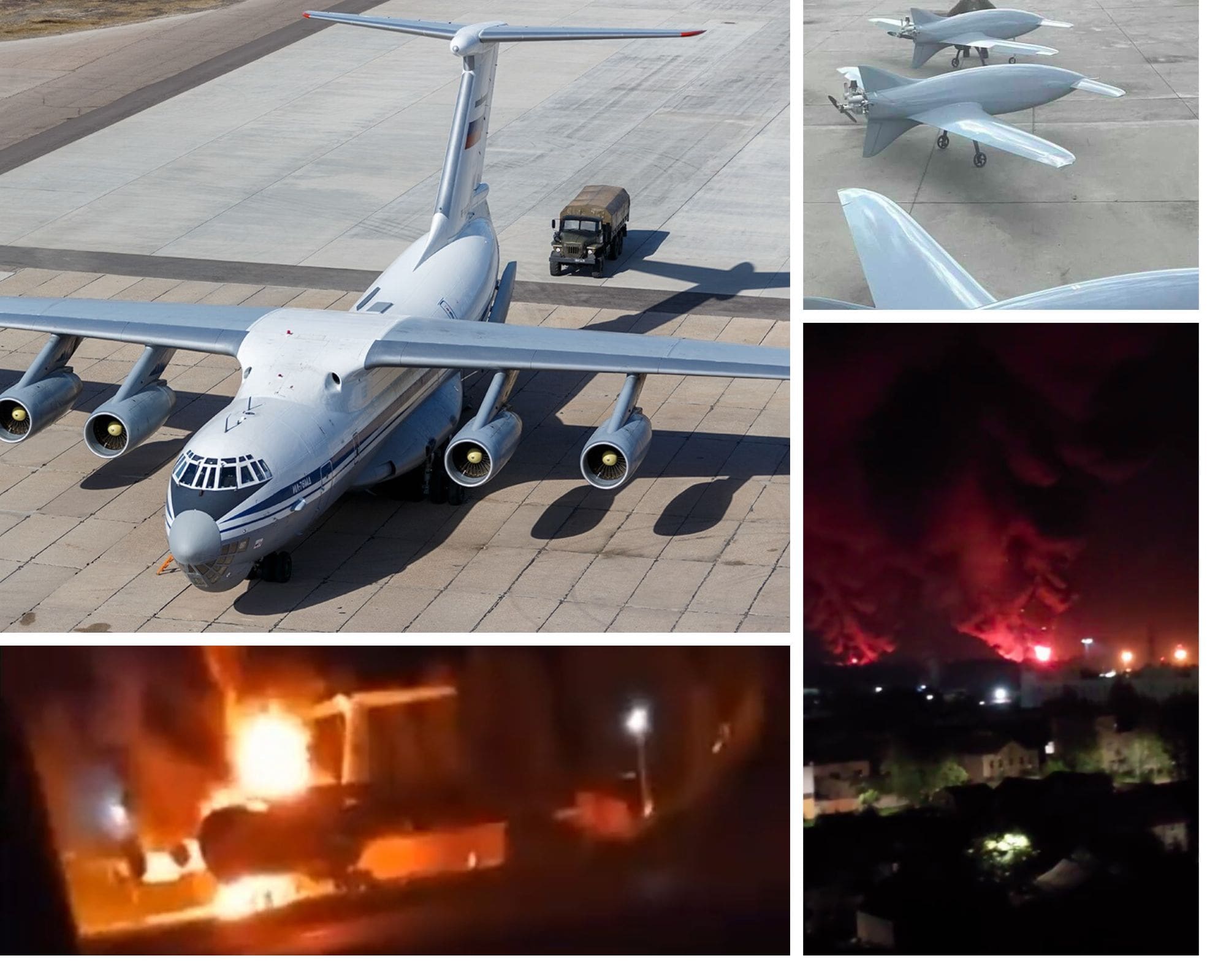 “…Como resultado del ataque con drones, cuatro aviones IL-76 han resultado dañados. Se ha iniciado un incendio, con dos aeronaves envueltas en llamas…A la llegada de las primeras unidades de bomberos y rescate se enviaron fuerzas y medios para extinguir el incendio. Por el momento no hay amenaza de propagación…” informó la agencia TASS en base a las palabras de un empleado de los servicios de emergencia locales.