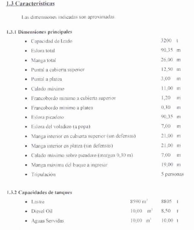 El dique flotante autocarenable será emplazado en la Base Naval Ushuaia, permitiendo la puesta en seco de los avisos de la clase Neftegaz, las corbeta MEKO 140, los patrulleros OPV 87/90 así como otros buques “…acordes a la capacidad y dimensión del mismo…”. El dique contará con una capacidad de elevación de 3.200 toneladas y tendrá la capacidad de ser remolcado a distintos puertos del litoral argentino.