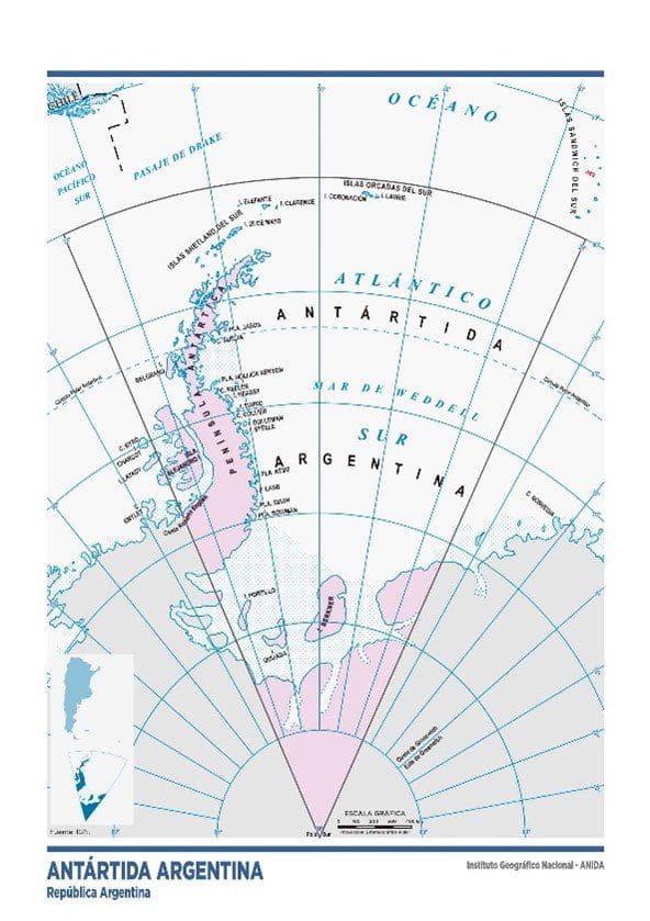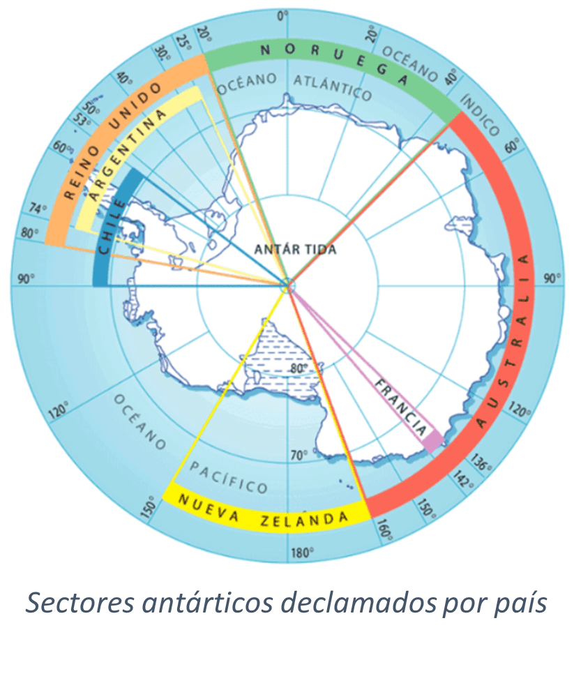 - El Sector Antártico Argentino y la Antártida Argentina terrestre (entre 25° y 74° O) están completamente incluidos dentro del Territorio de Ultramar “British Antarctic Territory” (entre 20° y 80° O) cuya soberanía pretende el Reino Unido.