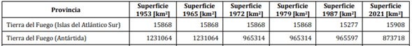 En la publicación del Instituto Geográfico Nacional “DETERMINACIÓN DE LA SUPERFICIE CORRESPONDIENTE AL TERRITORIO CONTINENTAL, ANTÁRTICO E INSULAR DE LA REPÚBLICA ARGENTINA”, pág. 75, Tabla 37 se muestra la siguiente evolución en la medición de la superficie antártica argentina: