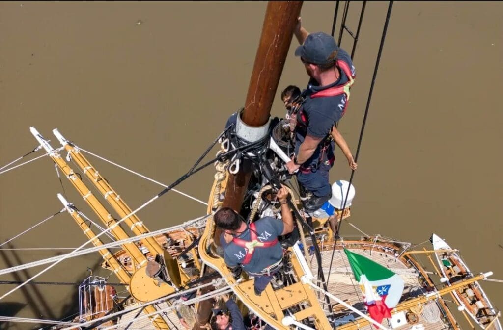 De acuerdo a imágenes compartidas en sus redes oficiales por la Marina Militare, tripulación del Américo Vespucio junto a personal del ARS comenzaron con las primeras tareas a bordo. En particular, se observan trabajos de desmontaje en el sistema de mástiles del buque, los cuales están siendo desmontados para su revisión en tierra.