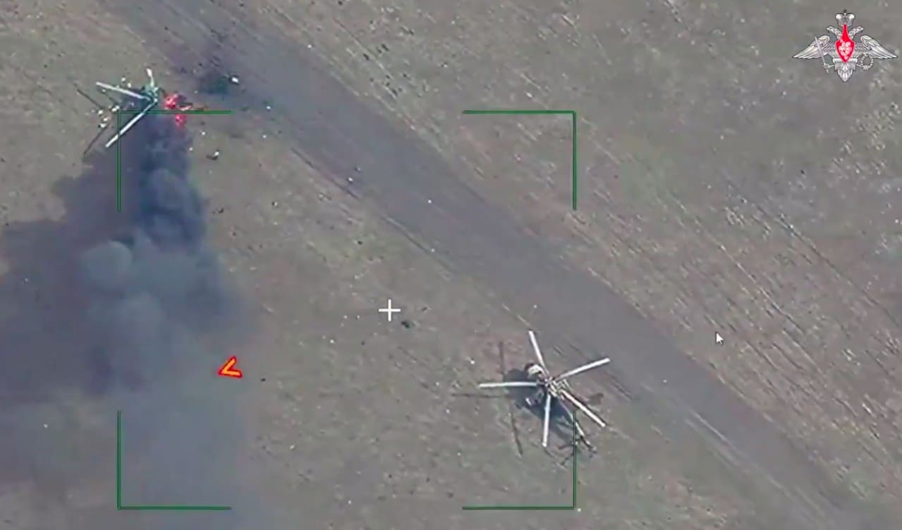Gracias a la secuencia difundida por la cartera de defensa rusa se puede apreciar como dos helicópteros ucranianos de la familia Mi-8 son alcanzados en un Punto Adelantado Reabastecimiento de Combustible. El ataque, coordinado desde un drone, se inició con el uso de un misil o cohete con municiones de racimo, las cuales no solo averiaron dos de las tres aeronaves, sino que también habrían provocado bajas entre el personal de vuelo.