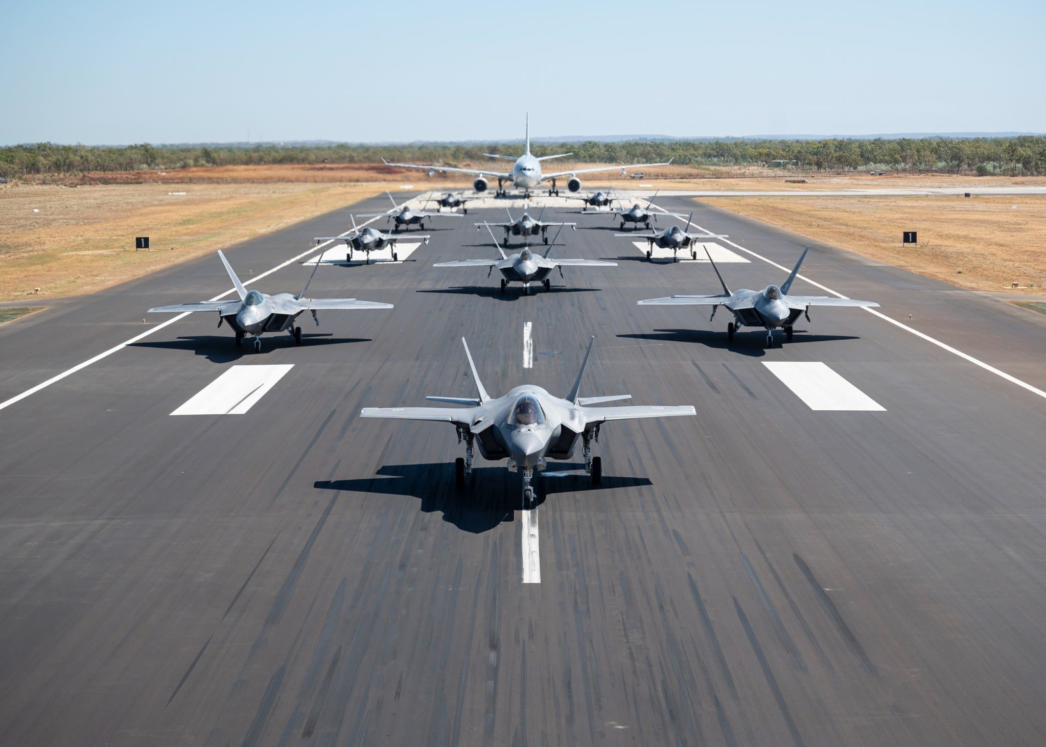 Como cierre del Pitch Black 2024, los F-22A Raptors asignados al 27º Escuadrón Expedicionario de Cazas, junto con los F-35A Lightning II de la Real Fuerza Aérea Australiana del Escuadrón Nº 75 y un avión KC-30A Multi Role Tanker Transport del Escuadrón Nº 33, realizaron un impresionante Elephant Walk en la Base Tindal de la RAAF.
