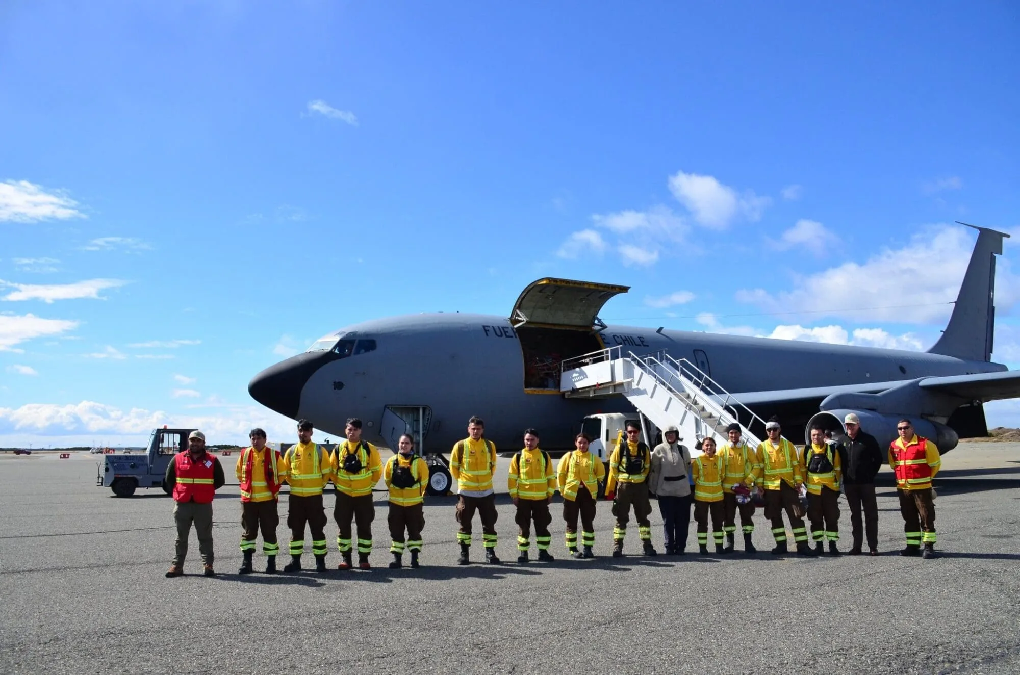 Con el objetivo de brindar apoyo el combate de incendios forestales en la Región de La Araucanía, la Fuerza Aérea de Chile (FACh) ha desplegado un operativo de emergencia movilizando personal y recursos a las zonas más afectadas. Para el transporte de personal y material llevo a cabo el despliegue de uno de sus Boeing KC-135 del Grupo de Aviación Nº10 de la IIª Brigada Aérea, el cual despegó desde la Base Aérea Pudahuel el 10 de febrero, trasladando 84 personas, entre Aviadores Militares y brigadistas de la Corporación Nacional Forestal (CONAF).