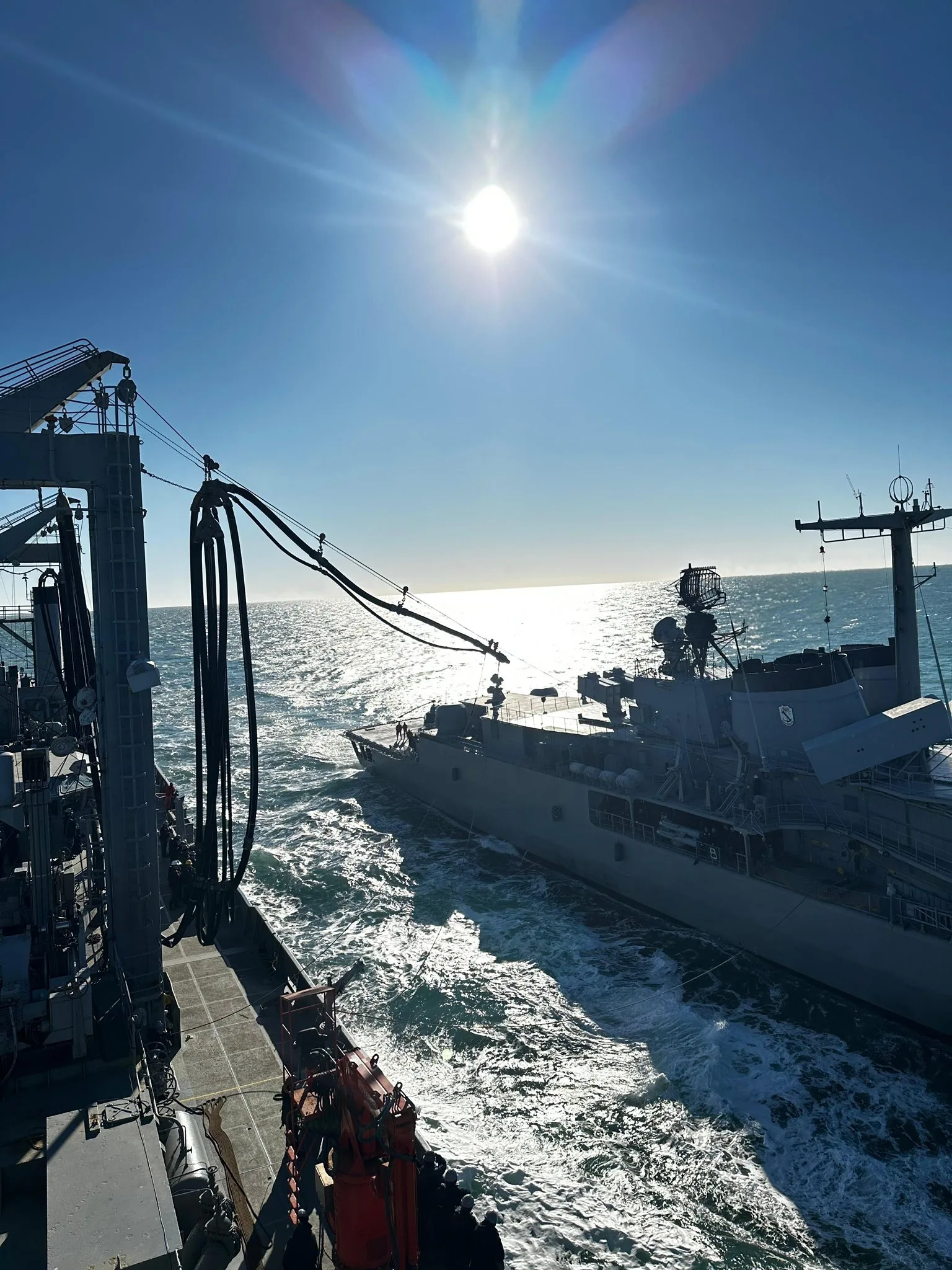 El buque logístico ARA Patagonia realizó la primera maniobra de reaprovisionamiento en el mar desde su recuperación y vuelta al servicio