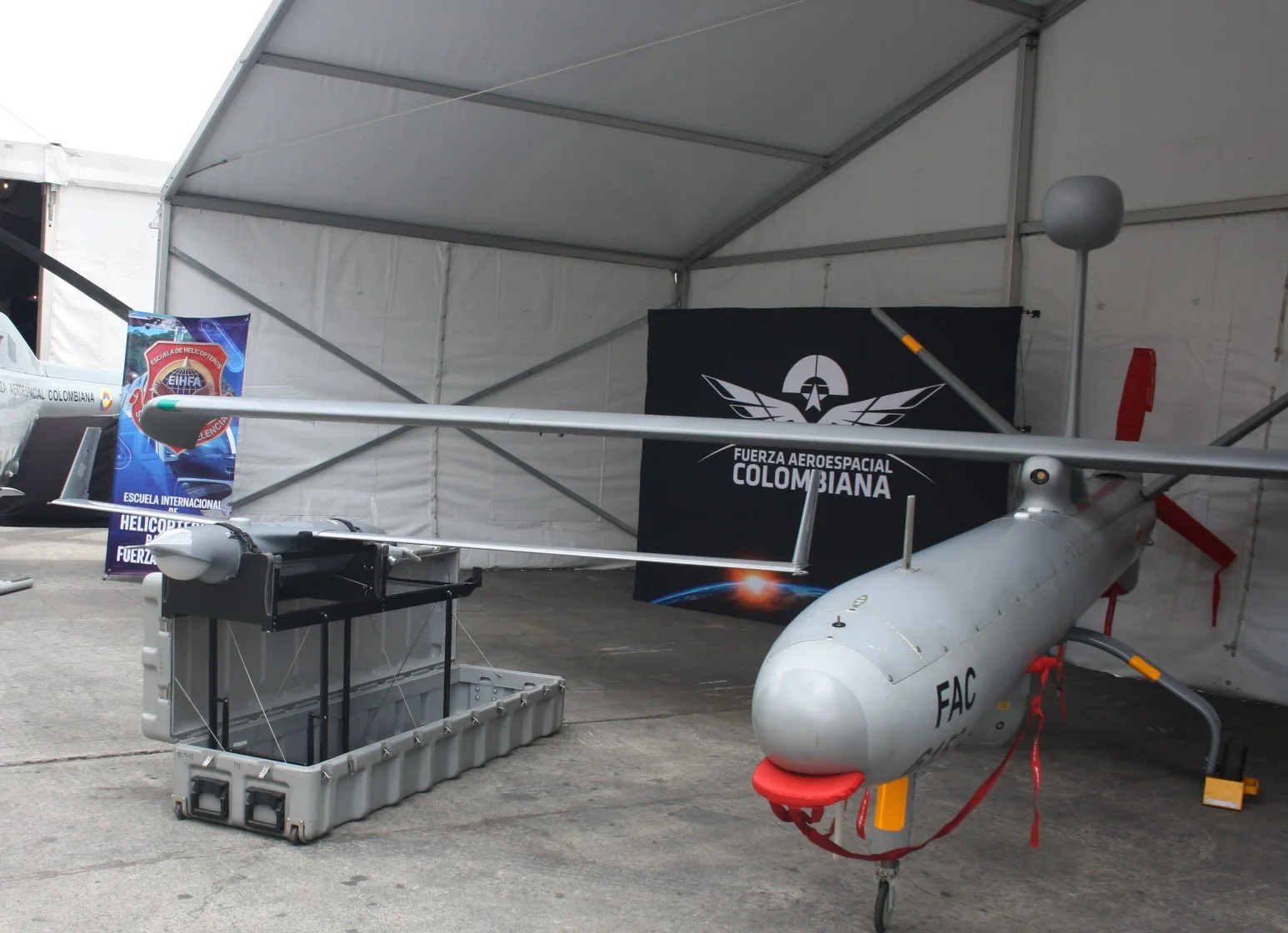 “En este momento tenemos en exposición dos aeronaves: el Hermes 450, que es de la empresa israelí Elbit Systems, que tiene un alcance de 250 km, funciona a través de línea de vista, tiene una autonomía de 16 horas dependiendo de su configuración y es utilizado para misiones de inteligencia, vigilancia y reconocimiento. Tiene una velocidad de crucero aproximadamente de 120 a 150 km/h y puede volar con una altitud de 6 km.