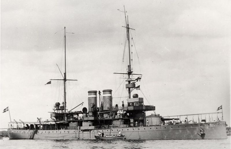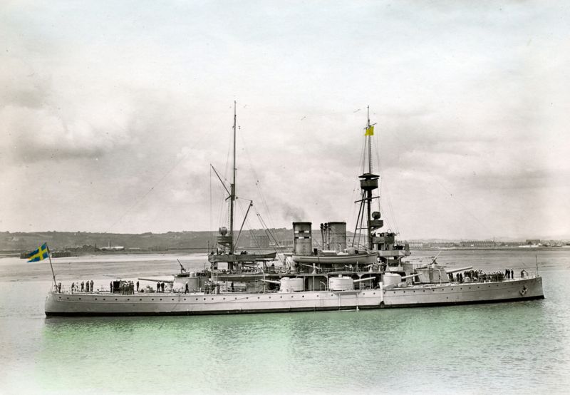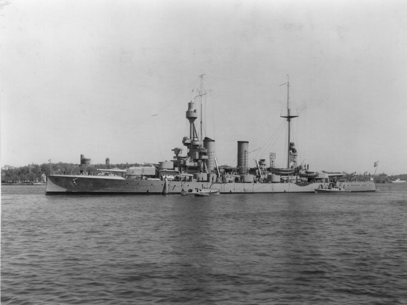 El USS Arizona (BB-39) en Pearl Harbor, Hawái, después de que sus incendios se hayan extinguido, el 9 de diciembre de 1941. El USS Navajo (AT-64) y el USS Tern (AM-31) están al lado, rociando agua para enfriar su superestructura de proa quemada y la zona del centro del barco.