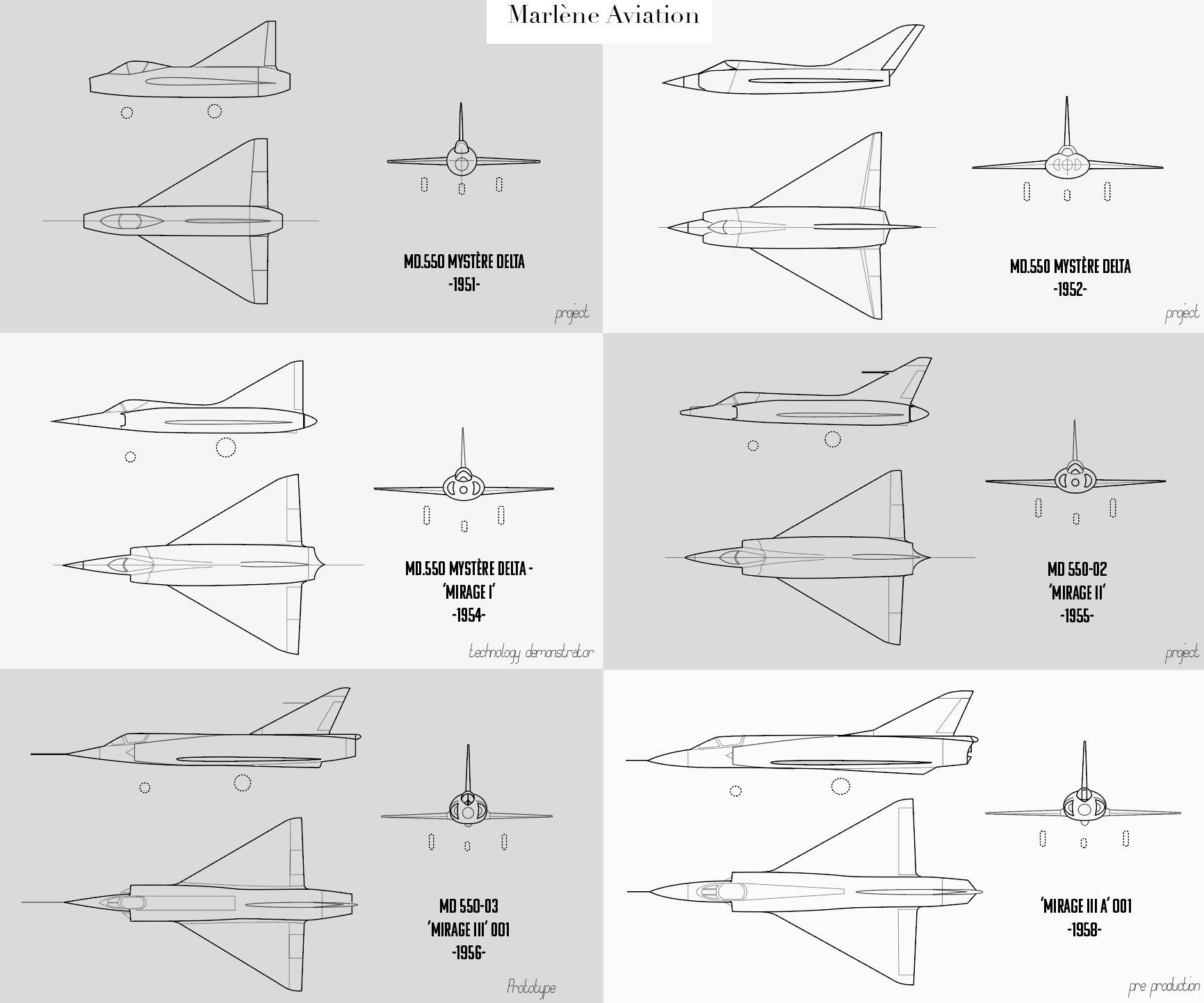 Evolución del 'Mirage III' desde el primer boceto de Dassault de un avión de ala delta en 1951 hasta el modelo de preproducción de 1958.