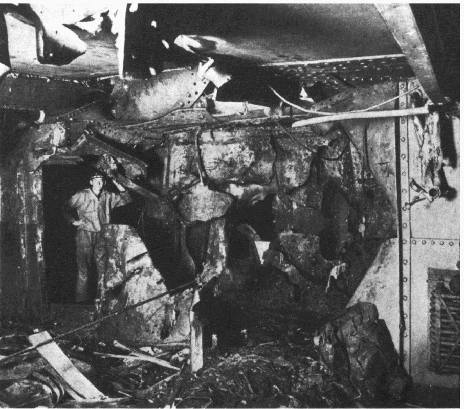 Se hicieron muchos daños a las estructuras ligeras y las válvulas de inundación de santabarbara quedaron enterradas bajo los escombros. Se inició un incendio entre los elementos de práctica almacenados debajo de la torre, y el humo denso y el gas que ingresaron a través de los troncos de ventilación rotos hicieron que ambas salas de máquinas de dirección fueran insostenibles durante 20 minutos. El fuego continuó ardiendo durante algunas horas y envolvió el barco en humo. No se encendió ninguna munición por este impacto y 2 cargas principales y 2 cargas delanteras en la cámara de trabajo y solo 6 o 7 pies de donde estaba perforada la barbeta, no sufrieron daños.
