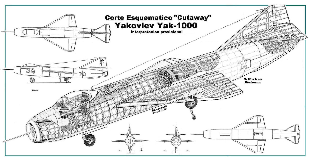 Cutaway Yakovlev Yak-1000, el avion experimental cuya ala habia sido fuente de investigaciones del TsAGI, las alas de bajo alargamiento, esta llamaba la atencion por ser "Romboidal" en realidad mas bien un triangulo mas cercano a un delta, su ventajas eran que seria mas facil de construir y mucho mas solida, con muy baja resistencia parasita y favoreciendo el vuelo mas alla de la velocidad del sonido, brindando unas prestaciones excepcionales para la epoca, con todas estas ventajas se elevó significativamente en el punto de inflexión en la historia de la tecnología de la aviación. y Yakovlev decidió probar. para lo que encargo el diseño y construccion de un prototipo, se habia pensado en construirlo alrededor de un motor AL-5 (IA-5) lo que le brindaria una velocidad maxima de Mach 1.7, al manifestarse los problemas que no fueron resueltos para esta inmadura planta motriz se decidio seguir adelante con un motor diferente el RD-500 (Copia rusa del Rolls Royce Derwent) de tan solo 1.591,72 Kgs de empuje e instalarlo al centro del fuselaje en formas cilindricas alargadas, sus prestaciones generales decayeron a tan solo 1.100 Km/h pero superaba al otro producto de la firma Yakovlev el Yak-23 "Flora" en 200 km/h de su velocidad maxima, con su toma de aire ubicada al frente, cabina poco mas atras muy proxima a la misma, con un parabrisas sin refuerzos de una pieza, con una baja y aerodinamica cubierta tipo burbuja, el ala "romboidal" comezaba un poco mas atras de la cabina con amplios alerones de gran superficie que tenia a media envergadura que contaba con compensadores, tenia un ligero tren con pequeñas ruedas retractiles de estabilidad ya que el tren de aterrizaje principal estaba ubicado bajo el motor, justo donde empezaba la larga tobera de descarga de gases, su rueda queda parcialmente expuesta aproximadamente como un 1/4 de su tamaño, con dos pequeños carenados que permitian mejorar su aerodinamica sin causar mayor arrastre (algo que hubiera ahorrado muchos problemas al Messerscmitt Me-163 Komet y su complicado patin) el motor estaba ligeramente descentrado hacia arriba ubicandose por encima del eje del fuselaje, por la misma razon facilitar la retraccion parcial del tren principal, sus superficies de cola en el mismo esquema "romboidal" y el estabilizador horizontal ubicado a casi un 1/4 de la ltura total de la deriva, algo curioso que se pudo notar es que la misma al parecer tenia capaciadad de moverse completamente (enteriza) con movimiento de las aletas traseras, esto es algo que se pensaba no habia sido desarrollado por los sovieticos, visto que los MiG-15 y sus versiones Bis no montaron este arreglo y en cambio su rival el North American F-86E los monto y volo en los cielos de Corea durante la guerra, mejorando sensiblemente sus maniobrabilidad y desempeño a muy altas velocidadaes transonicas. el Yakovlev Yak-1000 no llego tan siquiera a levantar el vuelo, hizo pruebas de rodaje, con no menos problemas por culpa del tren biciclo que lo hacian bastante inestable, las pruebas demostraron que por sus alas requeriria de velocidades mayores a las pensadas, sus pruebas en tierra fueron realizadas en febrero de 1951, Su aerodinamica sirvio de base para el desarrollo del misil anti-buque AS-2 Styx con motor cohete pero ahora con las superficies de cola en la parte trasera del fuselaje con diedro negativo, pasando a ser uno de los misiles antibuque mas prolificos de la historia, construyendose todavia en china en versiones muy mejoradas con mayor alcance, gracias a un nuevo motor jet con toma de aire bajo la seccion media del fuselaje. Cutaway modificado y realizado por