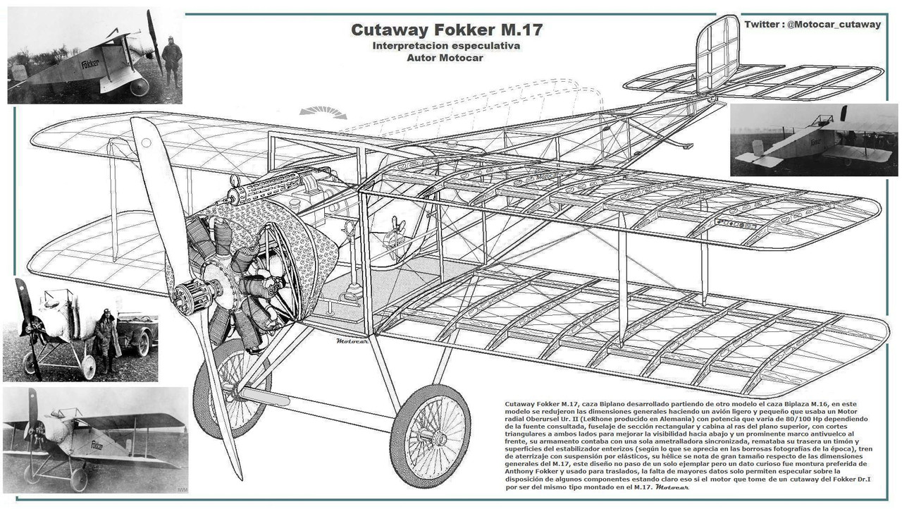 Cutaway Fokker M.17, caza Biplano desarrollado partiendo de otro modelo el caza Biplaza M.16, en este modelo se redujeron las dimensiones generales haciendo un avión ligero y pequeño que usaba un Motor radial Oberursel Ur. II (LeRhone producido en Alemania) con potencia que varía de 80/100 Hp dependiendo de la fuente consultada, fuselaje de sección rectangular y cabina al ras del plano superior, con cortes triangulares a ambos lados para mejorar la visibilidad hacia abajo y un prominente marco antivuelco al frente, su armamento contaba con una sola ametralladora sincronizada, remataba su trasera un timón y superficies del estabilizador enterizos (según lo que se aprecia en las borrosas fotografías de la época), tren de aterrizaje con suspensión por elásticos, su hélice se nota de gran tamaño respecto de las dimensiones generales del M.17, este diseño no paso de un solo ejemplar pero un dato curioso fue montura preferida de Anthony Fokker y usado para traslados, la falta de mayores datos solo permiten especular sobre la disposición de algunos componentes estando claro eso si el motor que tome de un cutaway del Fokker Dr.I por ser del mismo tipo montado en el M.17. Motocar