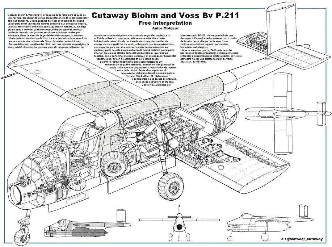 Cutaway Blohm & Voss Bv.211, propuesta de la firma alemana para el Caza de Emergencia, presentando varios modelos incluida la del interceptor con alas en flecha. Desde el punto de vista de la técnica de diseño usado para crear un caza de máxima sencillez muy compacto y ligero, usaría el motor BMW 003 y alas con largueros en madera, su fuselaje era en centro de todo, usaba una estructura de acero en laminas dobladas creando dos grandes secciones tubulares unidas por soldadura, llama la atención la genialidad del concepto, la sección tubular inferior servía como la toma de aire desde la misma se ubican desde adelante dos cañones MK 108 de 30 mm, las cajas de municiones, blindaje delantero, la cabina del piloto con una cubierta en plexiglas dé visión total, la mira y cristal blindado, los pedales y mando de gases, el bastón de mando y el asiento del piloto, con arnés de seguridad anclado a la unión de ambas estructuras, en ella se conectaba el martinete hidráulico de retracción de del tren de aterrizaje y las varillas de control de las superficies de vuelo, el boom de cola tenia estructuras con soportes para las raíces alares, las alas tenían estructura en madera y parte de esta estaba cubierta de lamina metálica por la parte inferior, en ellas se alojaba parte del combustible al igual que en fuselaje, en su parte final estaban la deriva y el estabilizador horizontal, todas las alas eran rectas dé sección única (todas las costillas iguales) para mayor simplicidad de construcción, el tren de aterrizaje triciclo con la rueda delantera retrayéndose hacia atrás con rotación de 90º teniendo un pequeño carenado interior, el tren principal se retraía hacia adelante alejándose lo a ambos lados de la parte trasera de la cabina. Tenía el tubo pitot en el lado exterior del plano derecho, aun así perdió frente al Heinkel He-162 “Salamander” al considerarse mas barato de producir, este usaba estructura de madera y el tren de aterrizaje reciclado del Messerschmitt Bf-109. No me queda duda que la desesperación nazi ante las oleadas casi a diario de bombarderos aliados pedía soluciones rápidas, económicas y que no consumiera materiales estratégicos. Llama la atención que tan fácil seria de volar por jóvenes pilotos preparados someramente para enfrentar a experimentados pilotos aliados, el Heinkel demostró no ser una plataforma fácil de volar durante las pocas salidas qué realizó ésos últimos días dé la guerra en Europa.