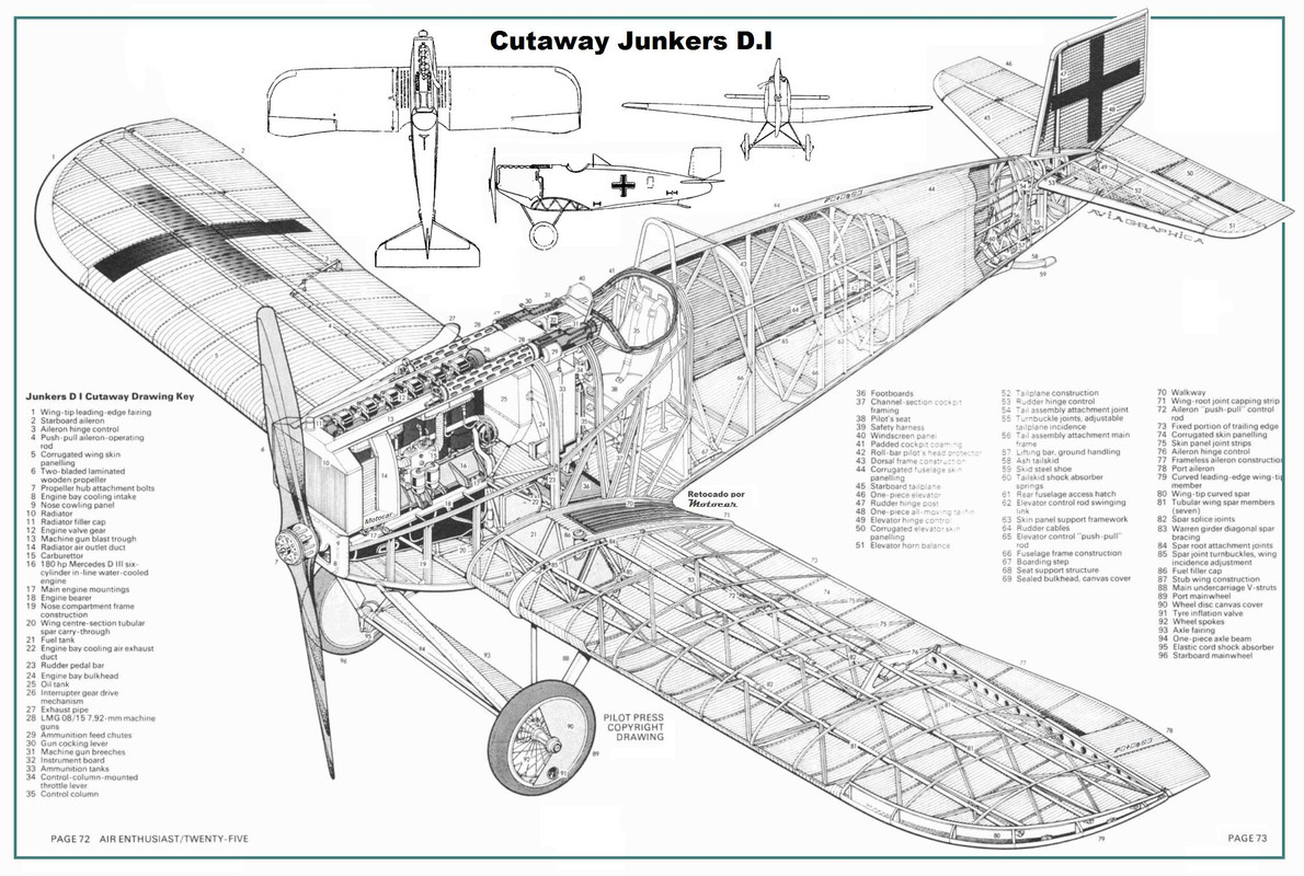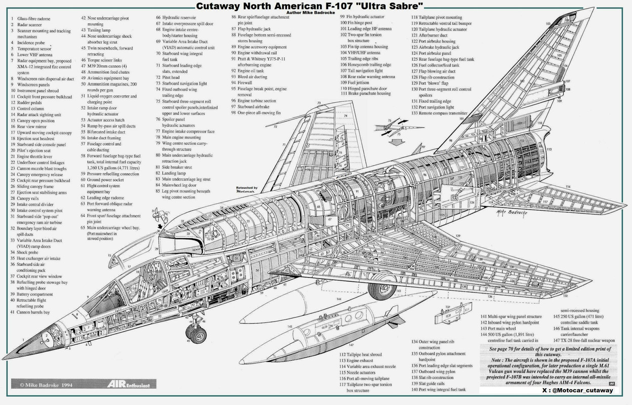 Cutaway North American F-107, el caza que compitió con el otro diseño de la Republic F-105 por un contrato para un caza de ataque, no logro el contrato pero voló con un inusual diseño de toma de aire bifurcada para manejo de las ondas de choque, carecía de la bodega de armas del Thunderchief pero su carga nuclear iba semi-carenada en el vientre de este Ultrasabre, que también poseia una deriva enteriza (vista luego como deriva plegable en el North American A5J "Vigilante") estaba previsto que superara el Mach 2 en altura, conservaba un ala parecida a la de su predecesor el F-100 Super Sabre con el que comparte muchas características comunes de diseño aunque con mayores dimensiones, estaba propulsado por motor Pratt&Whitney J75 de 11.000 Kgs de empuje, tenia un aspecto moderno fuera de lo común, autor Mike Badrocke y publicado en la revista Air Enthusiast de 1994 y compartido desde la web rusa: