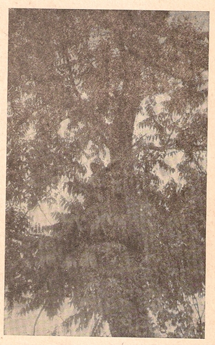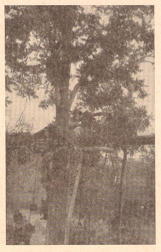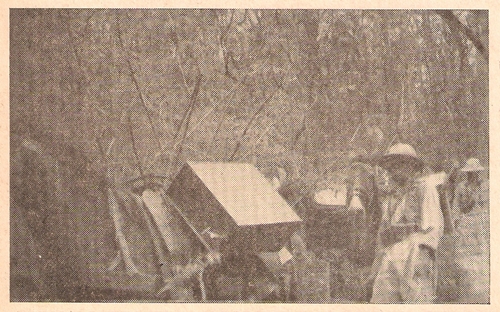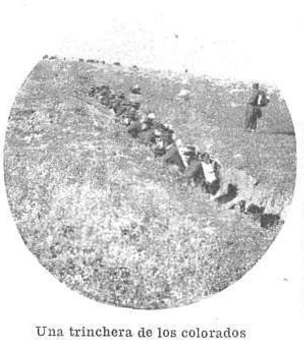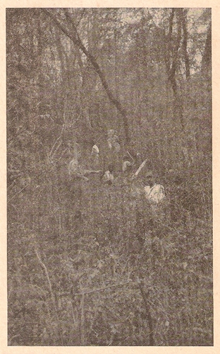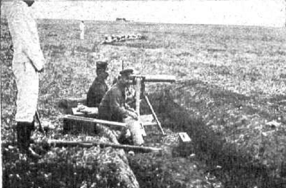 Una ametralladora en posicion sobre una "chapapa". Desde un arbol, el jefe de ametralladora dirige el fuego, puede observarse como un soldado, por medio de una cuerda, hace llegar las cajas de municion a la ametralladora