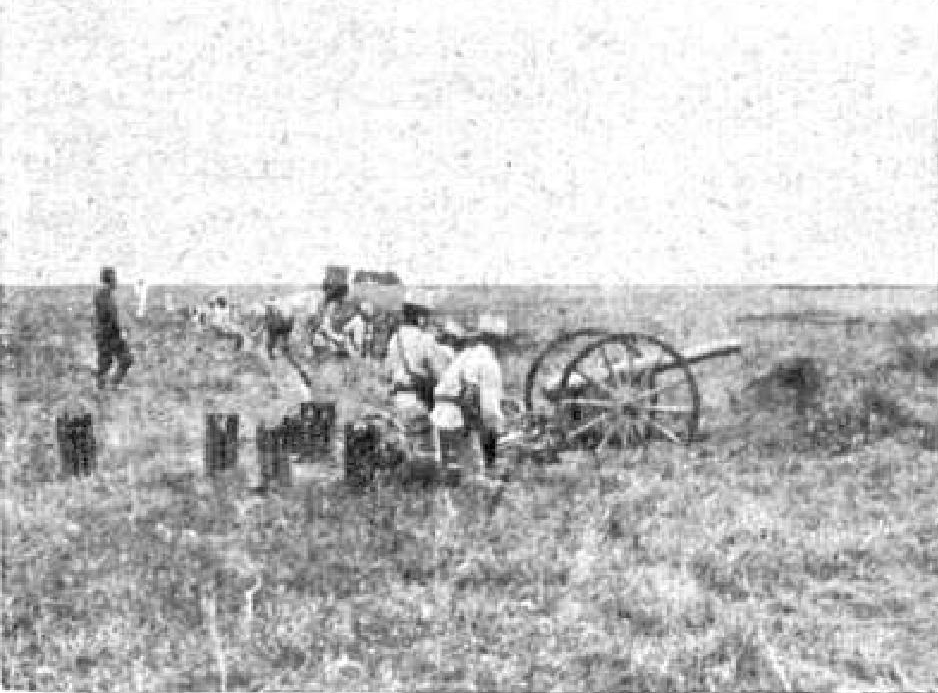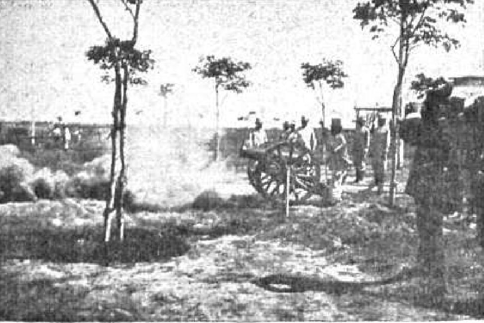 El teniente Baesi, profesor de balistica, en el acto de efectuar el primer disparo con el obus de 105mm recientemente adquirido