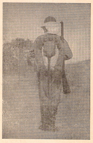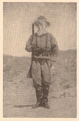 Uniforme para el soldado montés, a) casco de corcho, la cara cubierta con tul (para preservarse de los mosquitos, mbarigüyes, etc), b) blusa y pantalon de loneta (frescos y resistentes), c) Carabina, es muy manuable en el monte, d) botas de media caña con clavos en la suela y taco