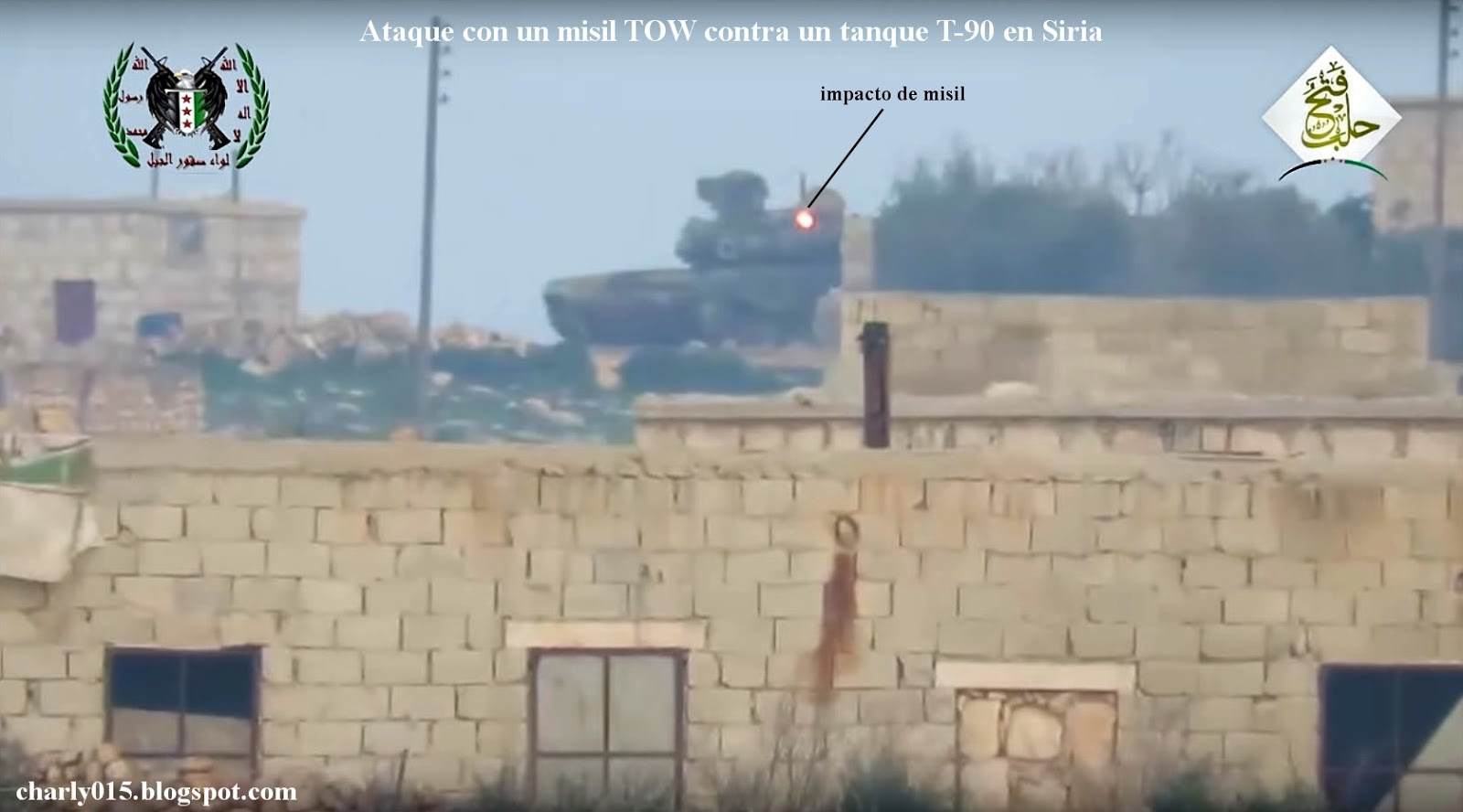 Esto explicaría porque el tanque tiene las escotillas abiertas, porque vemos los disparos con la 12,70 contra el equipo TOW rebelde y porque el tanque ofrece el arco frontal de la torre (su mejor protección) contra el sector en el que está posicionado el lanzador TOW. http://charly015.blogspot.com.uy/2016/02/ataque-contra-un-t-90-en-siria_28.html