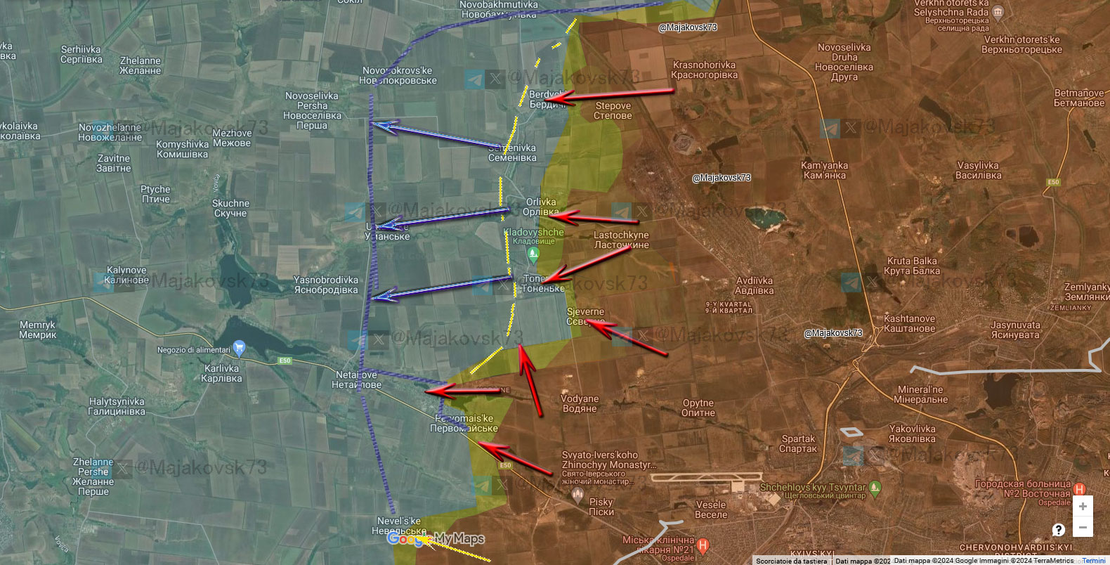 Frente de Donetsk: Después de Sjeverne esta mañana, los rusos toman Stepove y entran en las primeras casas de Berdyanchi. También se acercan a Orlivka y Tonenke. Dada la velocidad, se supone que los ucranianos están abandonando gradualmente esta línea para retroceder más, en la línea Natailove-Ocheretyne, donde hay fortificaciones desde 2014.