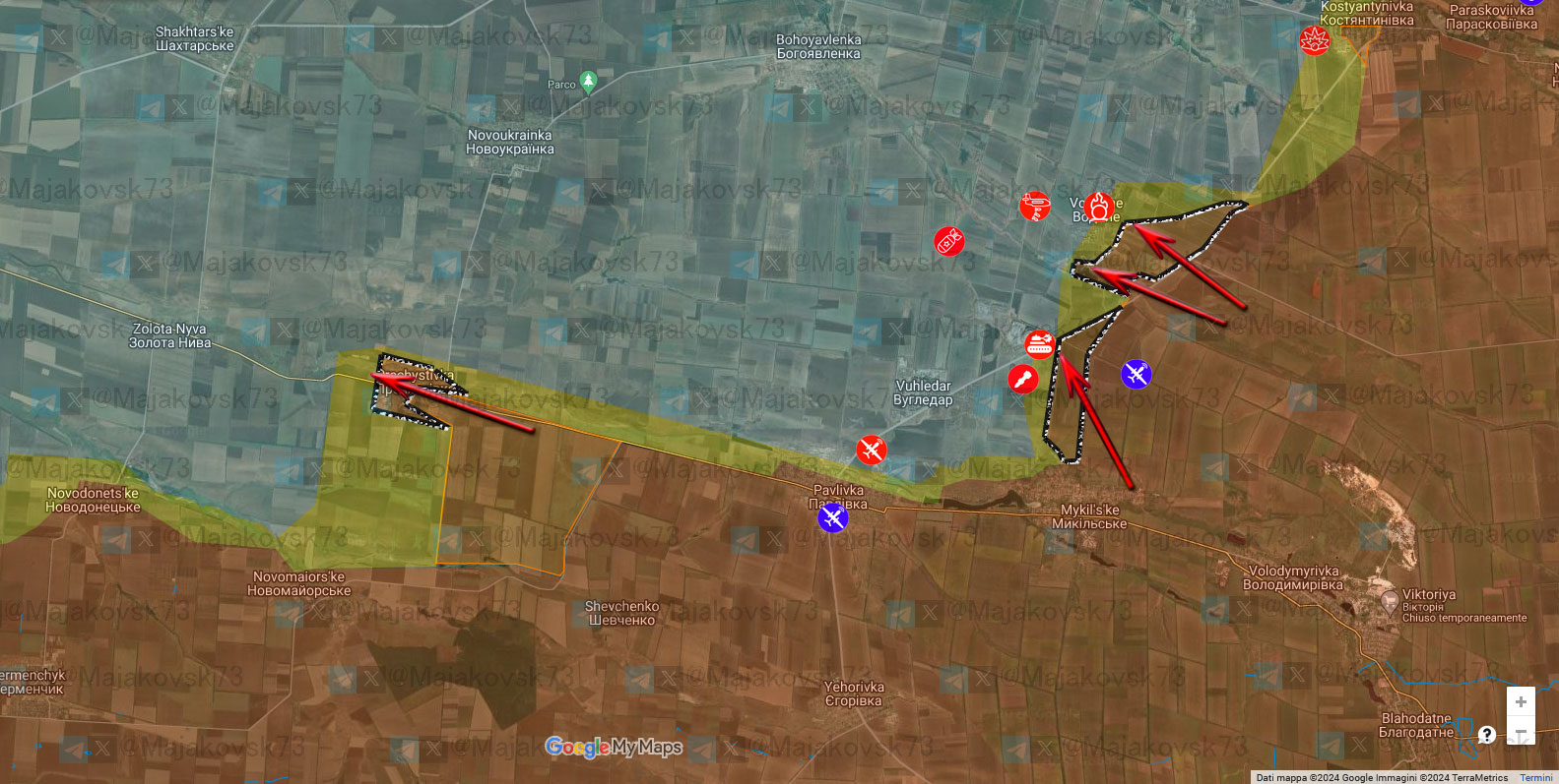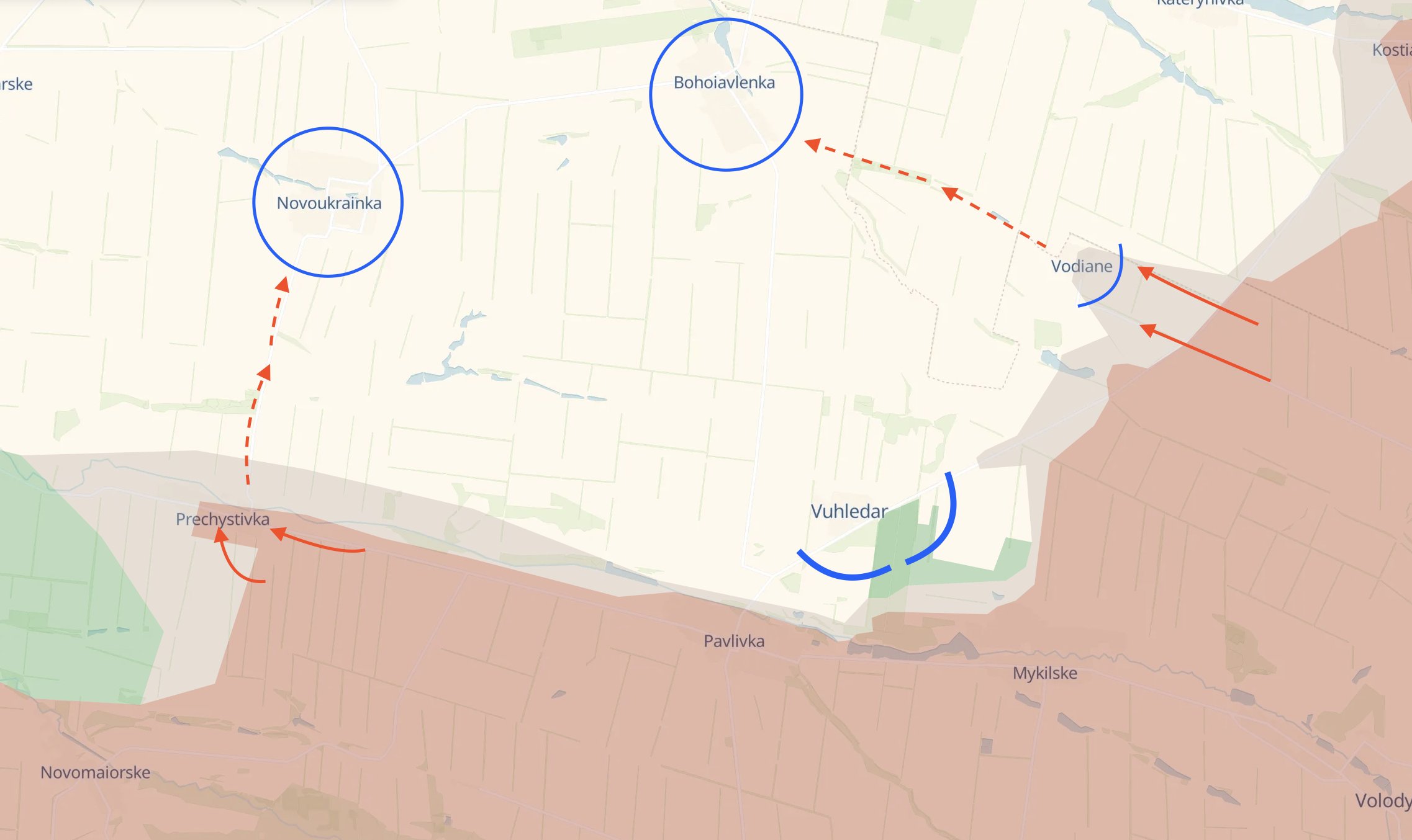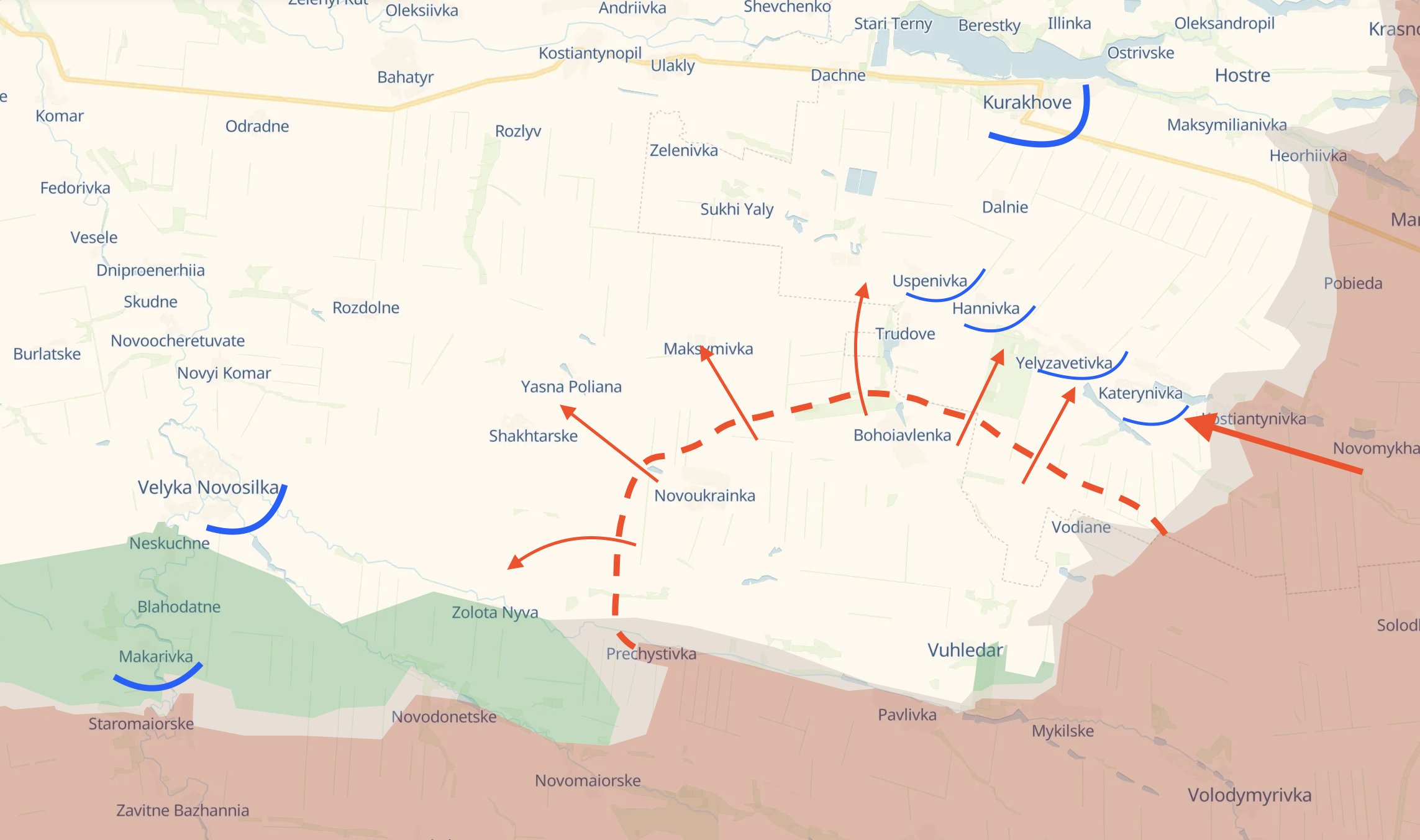 Pero las tropas de Vugledar no pueden hacer nada contra el amplio cerco. Después de la captura de Vodyanoye, a las unidades rusas les quedarán 8 kilómetros hasta Bogoyavlenka. Y desde Prechistovka hay sólo 6 kilómetros hasta Novoukrainka.