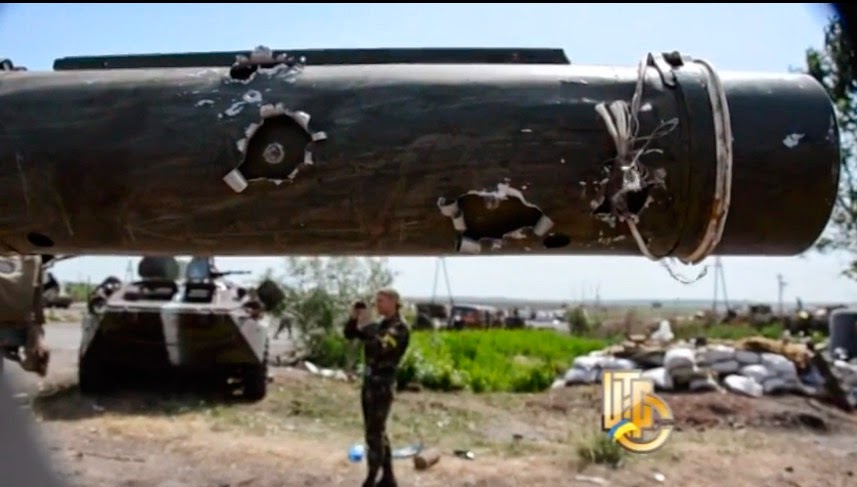 Las novedades han sido en el material utilizado por ambos bandos. El ejército ucraniano ha comenzado a usar tanques T-64. En el vídeo y foto se puede ver un T-64B alcanzado por el fuego de los rebeldes. Los que causaron los daños sabían muy bien lo que hacían porque han impactado en la óptica y faro IR. En la parte posterior el tanque ha sido alcanzado por un RPG-26 (lo más probable). Destaca que este tanque no utilice los ladrillos ERA, que son muy útiles en este tipo de combate.