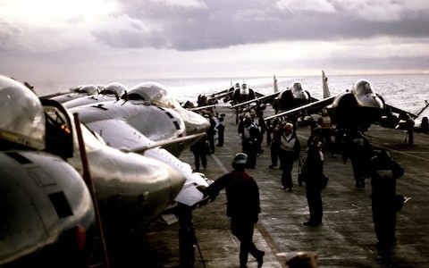 Sea Harriers en la cubierta de vuelo del HMS Hermes mientras patrulla con el grupo de trabajo británico frente a las Islas Malvinas, 1982 CRÉDITO: PA