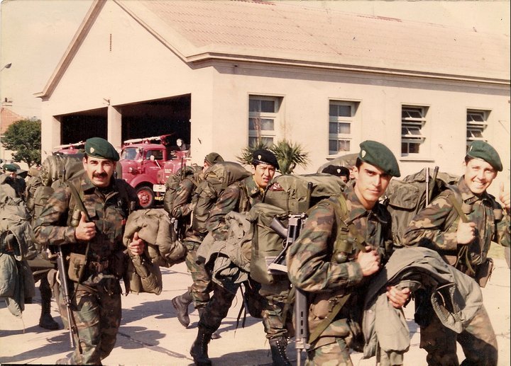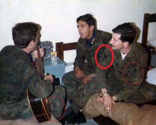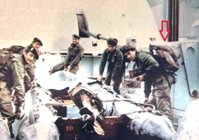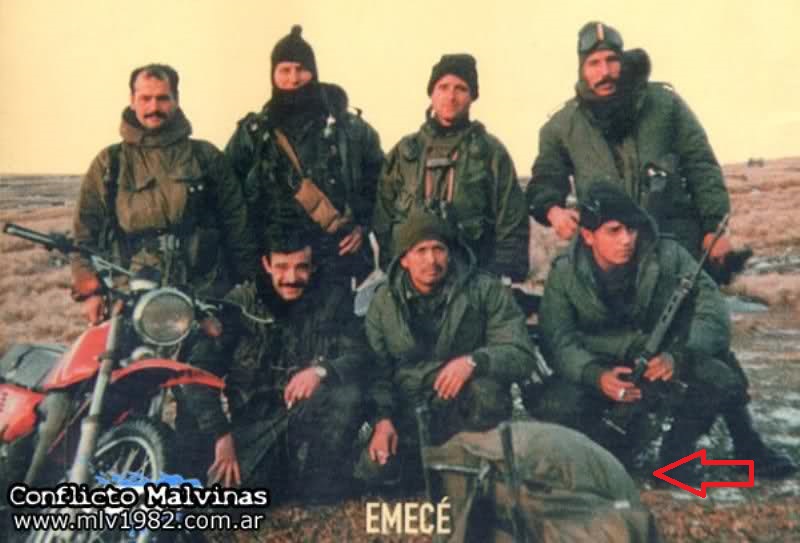 El Teniente Reyes tiene colocado sobre el pullover el abrigo de matelasé relleno de guata,que era de quita y pon de nuestras garibaldinas (parka para la IMARA),sobre este un chaleco antiesquirlas color blanco tiza,estos chalecos antiesquirlas estaban distribuidos en las Unidades que tenian Baterias de AA y tambien los usaban los artilleros de Chinook,post conflicto fueron entregados a todas las Brigadas y Bases Aereas como complemento para el equipamiento del personal que cumplia guardias,en las Brigadas,Bases e Institutos tambien habian chalecos anti balas que eran muy particulares,pues tenian un cuello protector,y las placas cubrian hasta los testiculos en una forma de terminacion redondeada,eran muy pesados pero muy seguros,de origen USA,eran de color azul oscuro.