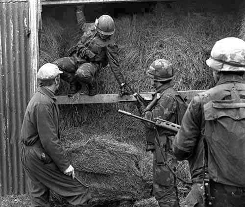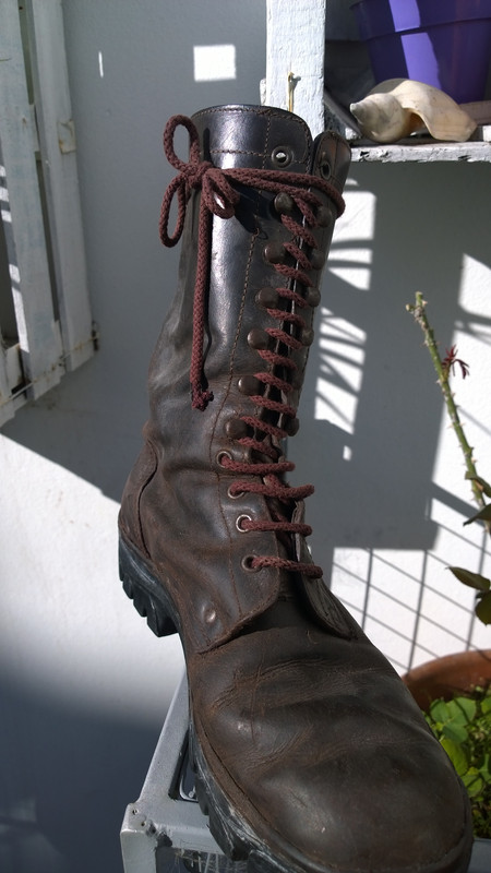 Muy buenos borceguies de doble costura.Cuando comencé a equiparme la tarde noche del 26 de abril para desplegar al POA en Lafonia,ademas de seleccionar el armamento que iba a utilizar,municiones,granadas de mano,granadas Strim,mochila,carpa,red Barracuda,raciones de combate y tantas otras cosas...encontré en un cuarto de utencillos para jardin cerca de la Escuela de GG,casi como una mini taller ,un tarro de cera para piso KLEAR de Jhonson & Jhonson,con siliconas,no lo dudé me pinté los borceguies con esa cera para piso,salia olor a mi casa cuando mi madre lustraba el living,le pasé a las costuras varias veces,la dejaba cecar y otra vez,estaban como engrasados opacos,no les saqué lustre,asi que tuvieron una buena capa repelente,asi fué que nunca me entró el agua a los pies,cuando el 12 de mayo retorné por 48 hs a la BAM CONDOR,luego de cambiarme de uniforme le hice el mismo tratamiento con la KLEAR.