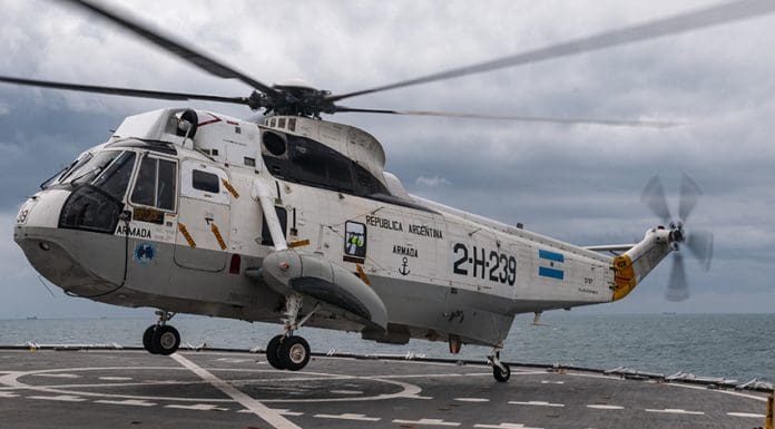 El Comando de Aviación Naval de la Armada Argentina pone en vuelo un helicóptero Agusta ASH-3H Sea King